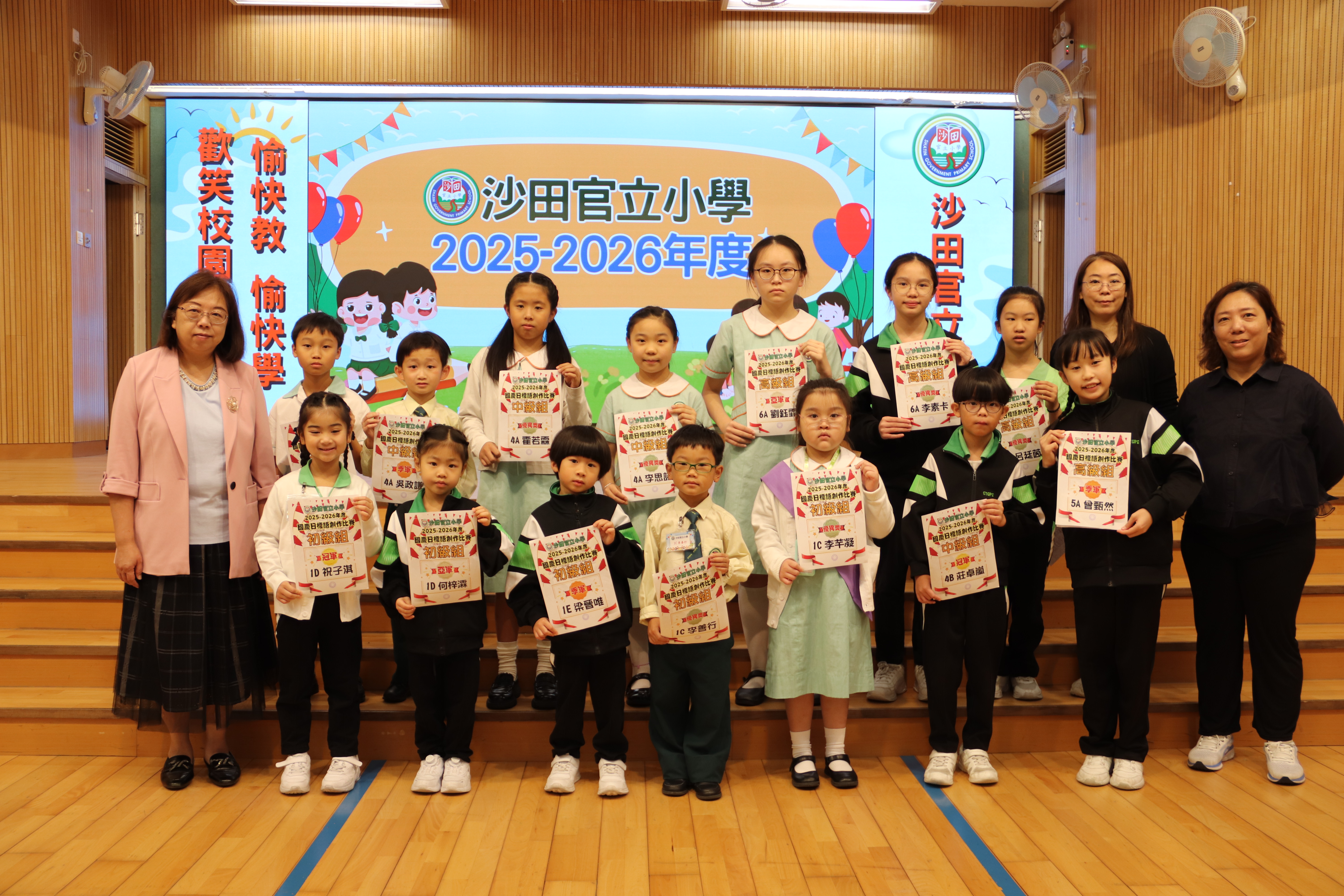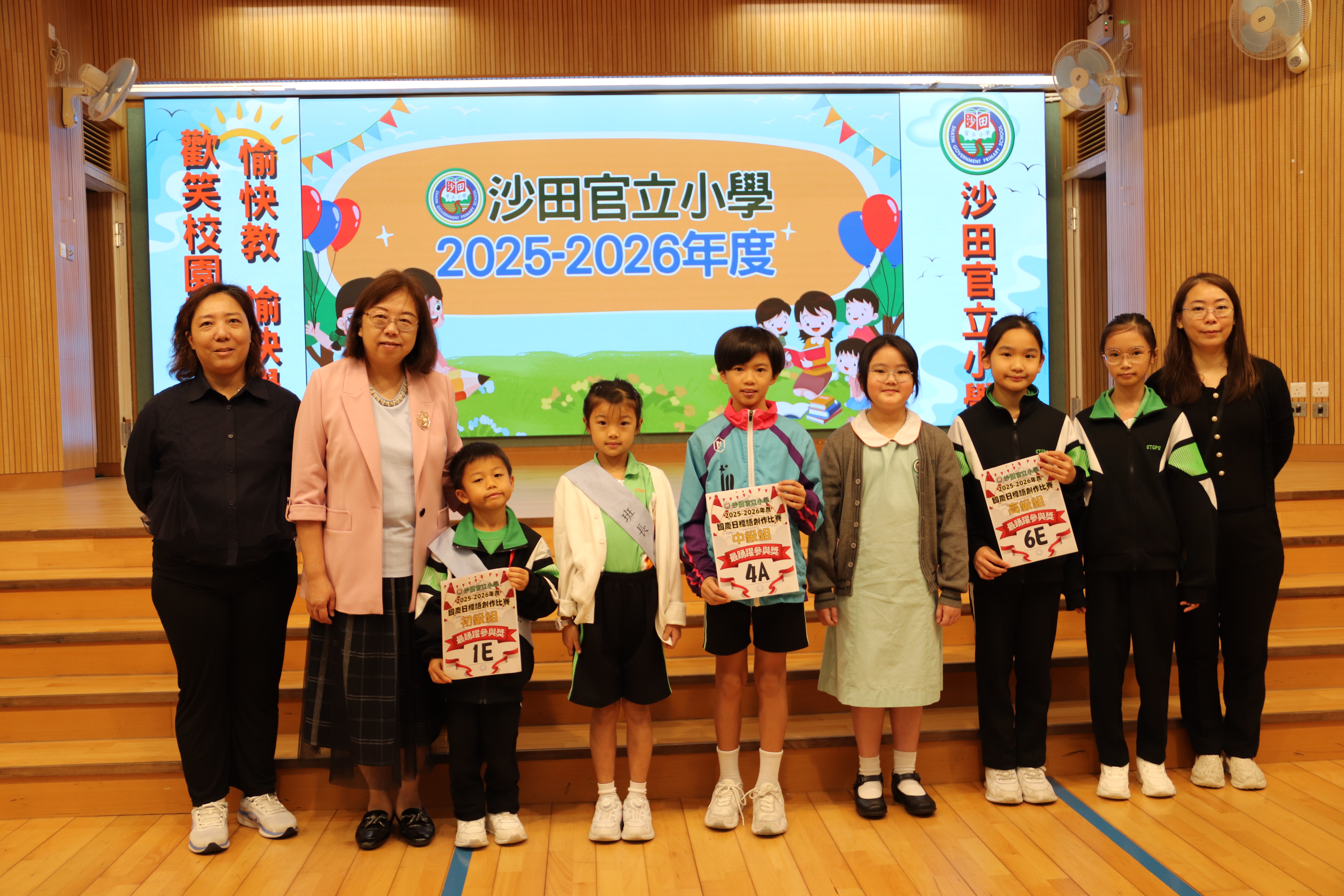 李校長、吳主任和劉主任與得獎班別代表合照。