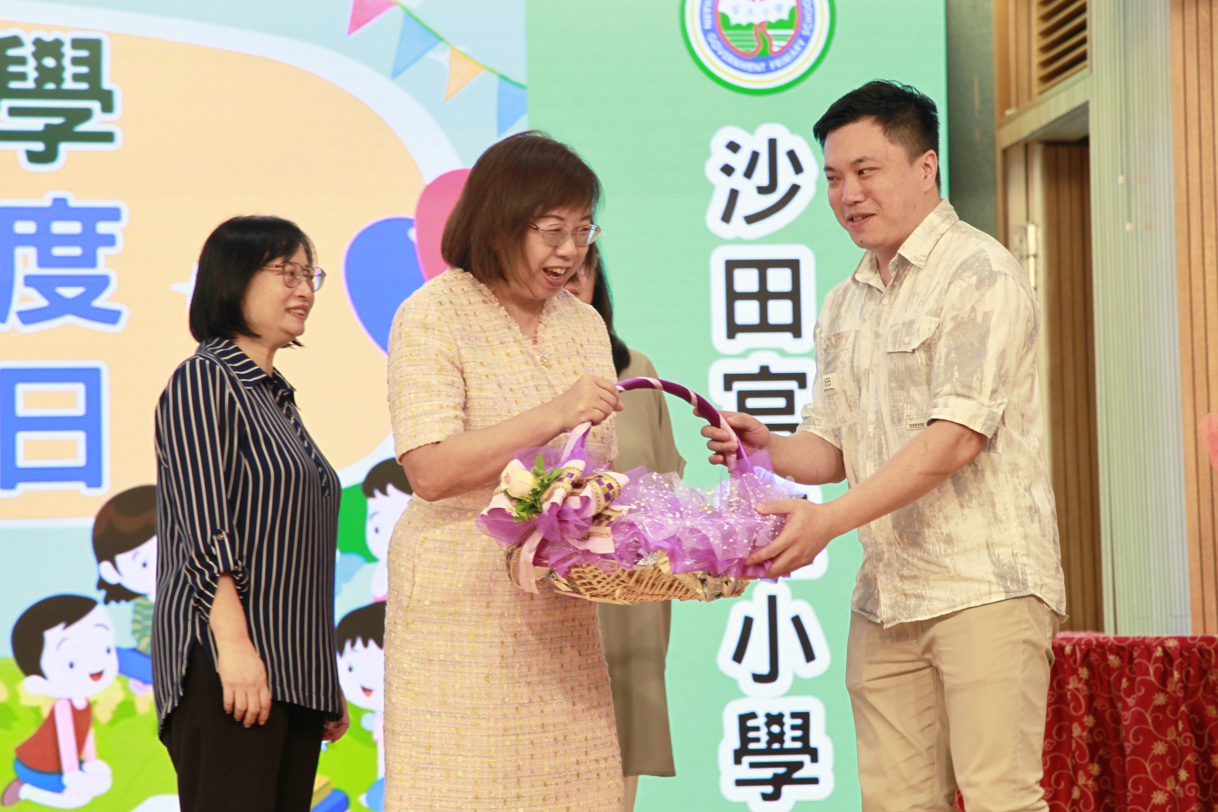 最後,家長教師會代表向學校致送水果籃,以表達家長及學生對校長及教師們的心意。校長及三位副校長與家長代表拍照留念。 |