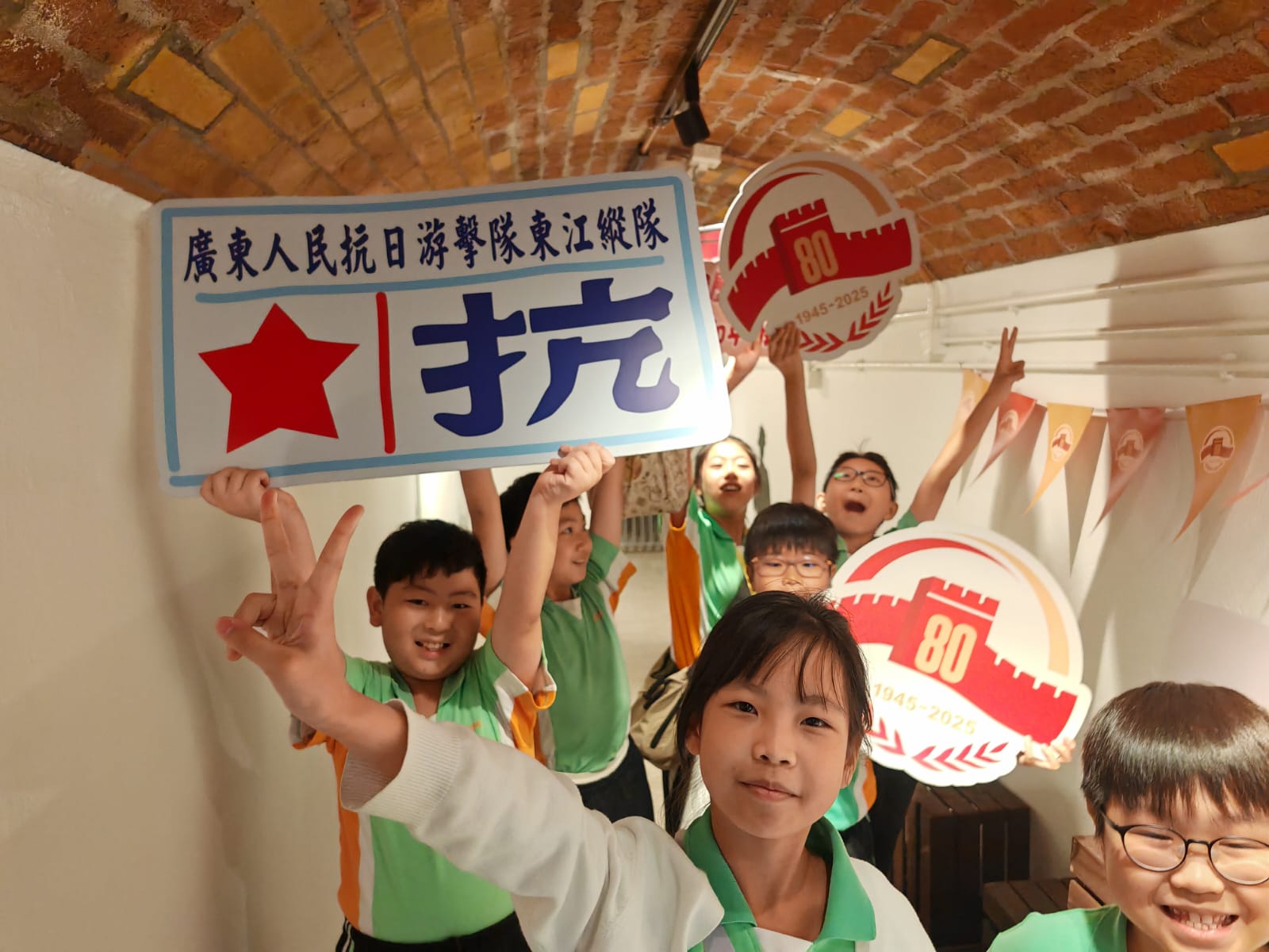 同學們舉起「東江縱隊」展示板,認識這支在抗戰中英勇奮戰的隊伍,感受先輩為保衞家園付出的犧牲與努力。