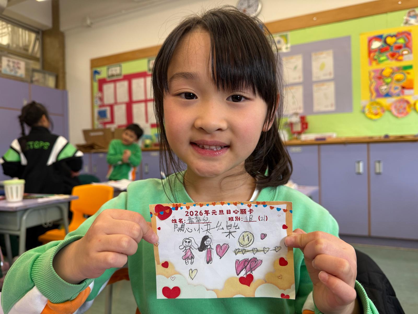 為迎接2026年新一年的開始,本校於1月6日早上舉行元旦日慶祝活動。活動開始,全校師生齊聚參與莊嚴的升旗儀式,隨後由6A班彭子柔和李凱欣帶來了精彩的旗下講話,他們不僅分享了迎接元旦的喜悅之情,還說出對未來生活的憧憬。升旗儀式結束後,學校還安排了全校每一位同學獲發一張心願卡,主題是「新年新氣象,逐夢2026」。每位同學在心願卡上寫上今年的學習目標、追求健康生活的理想,還有自己的未來夢想。國民教育組集齊同學的心願卡後,選取最有代表性的心願卡掛上剪板上,讓全校老師和同學一齊立下新年的目標,以更積極的態度投入學習與生活,為實現中華民族偉大復興貢獻力量。