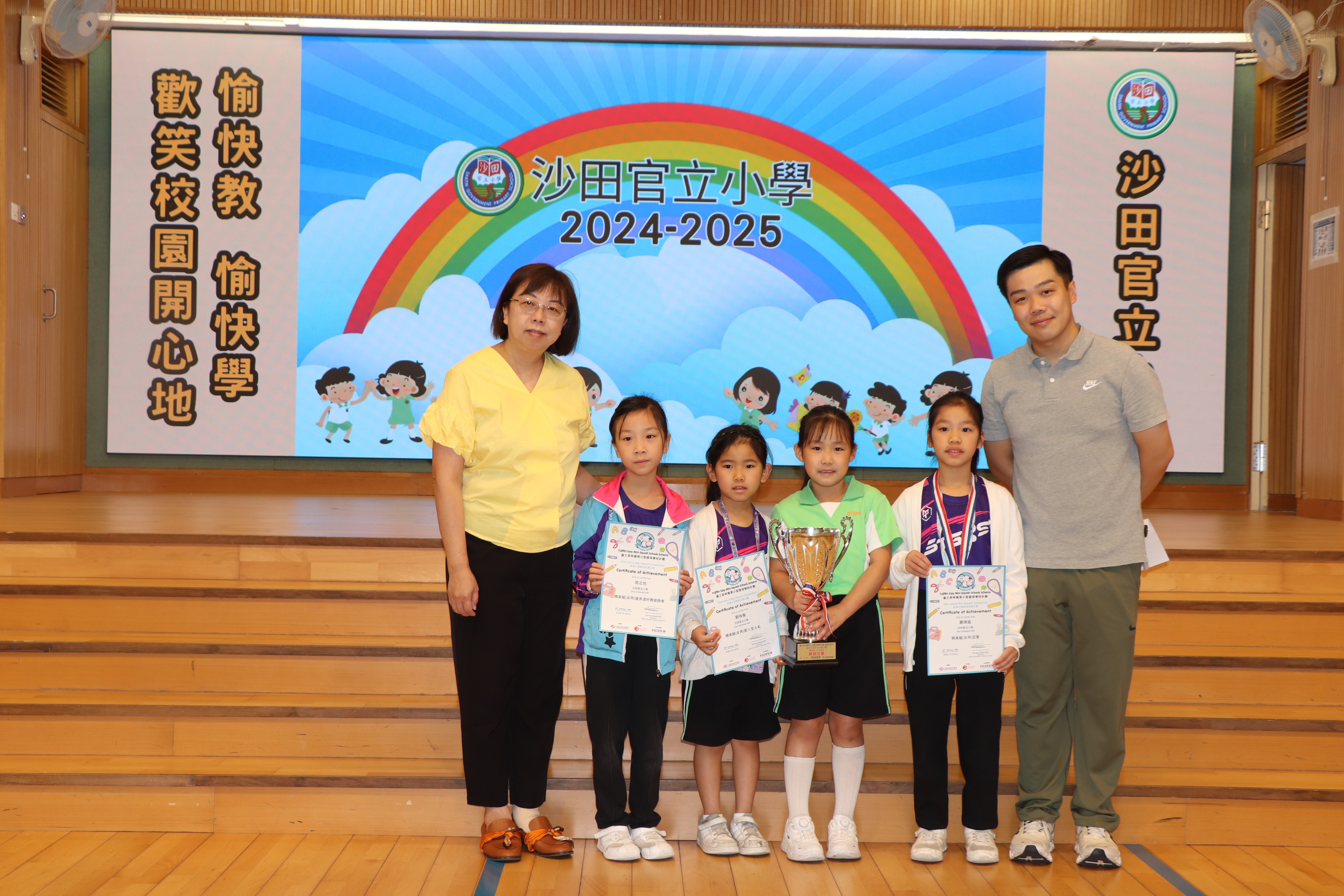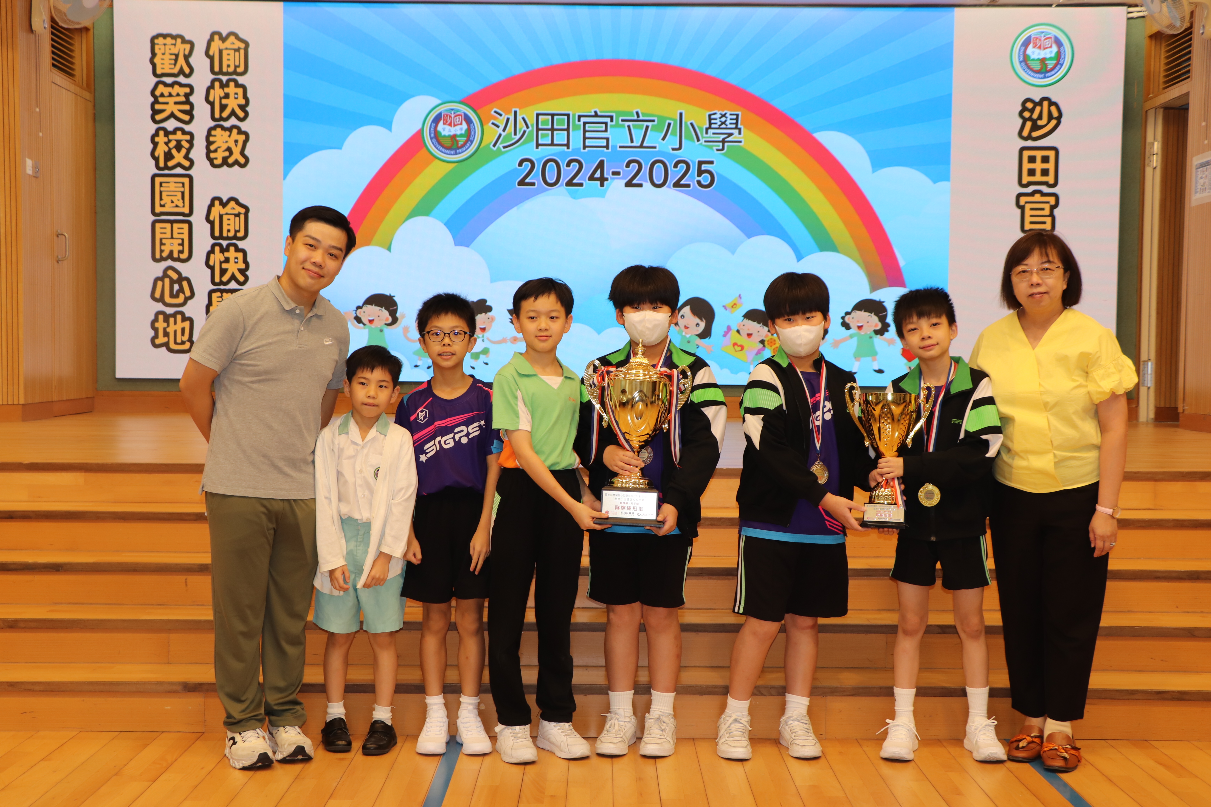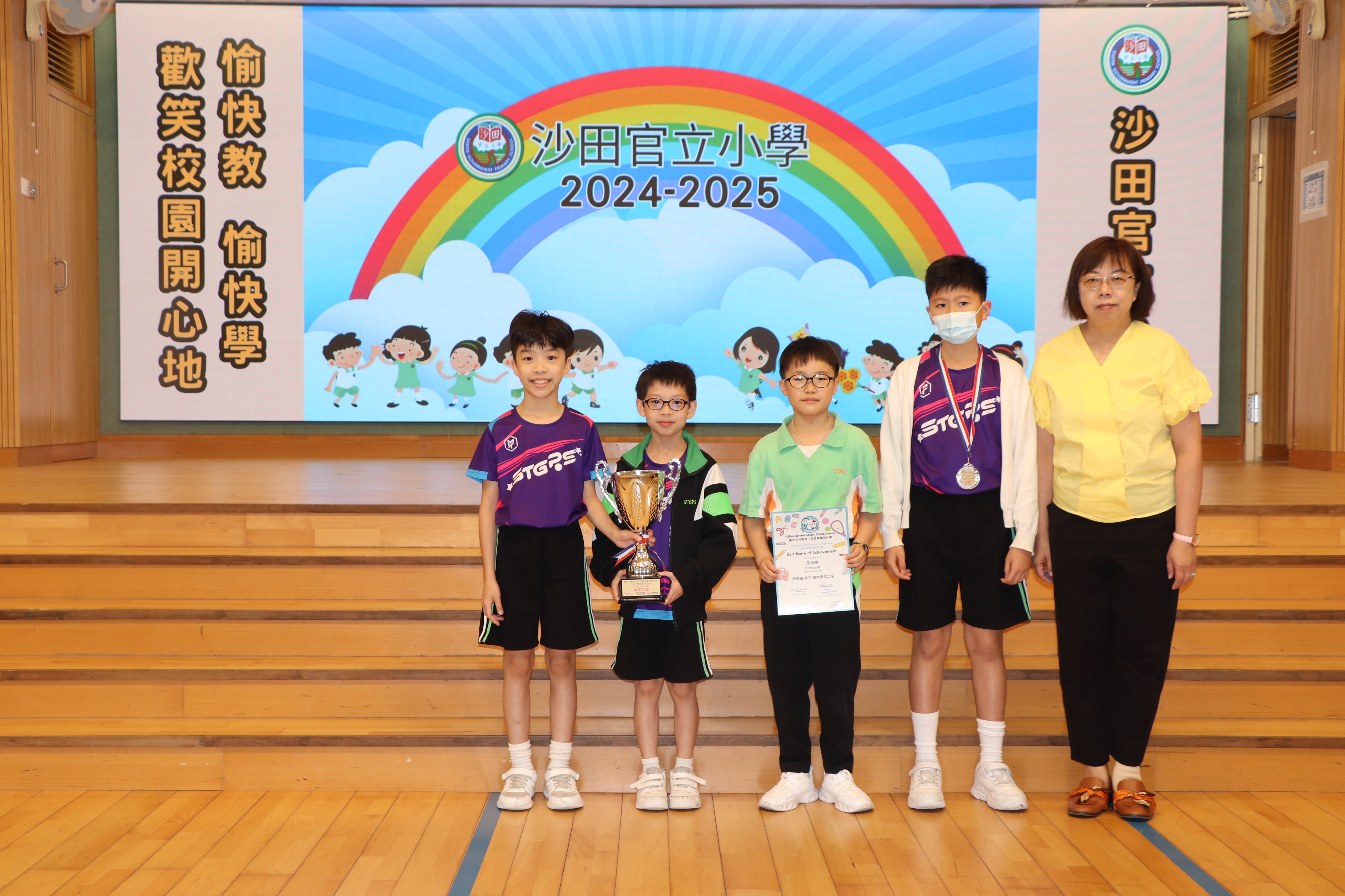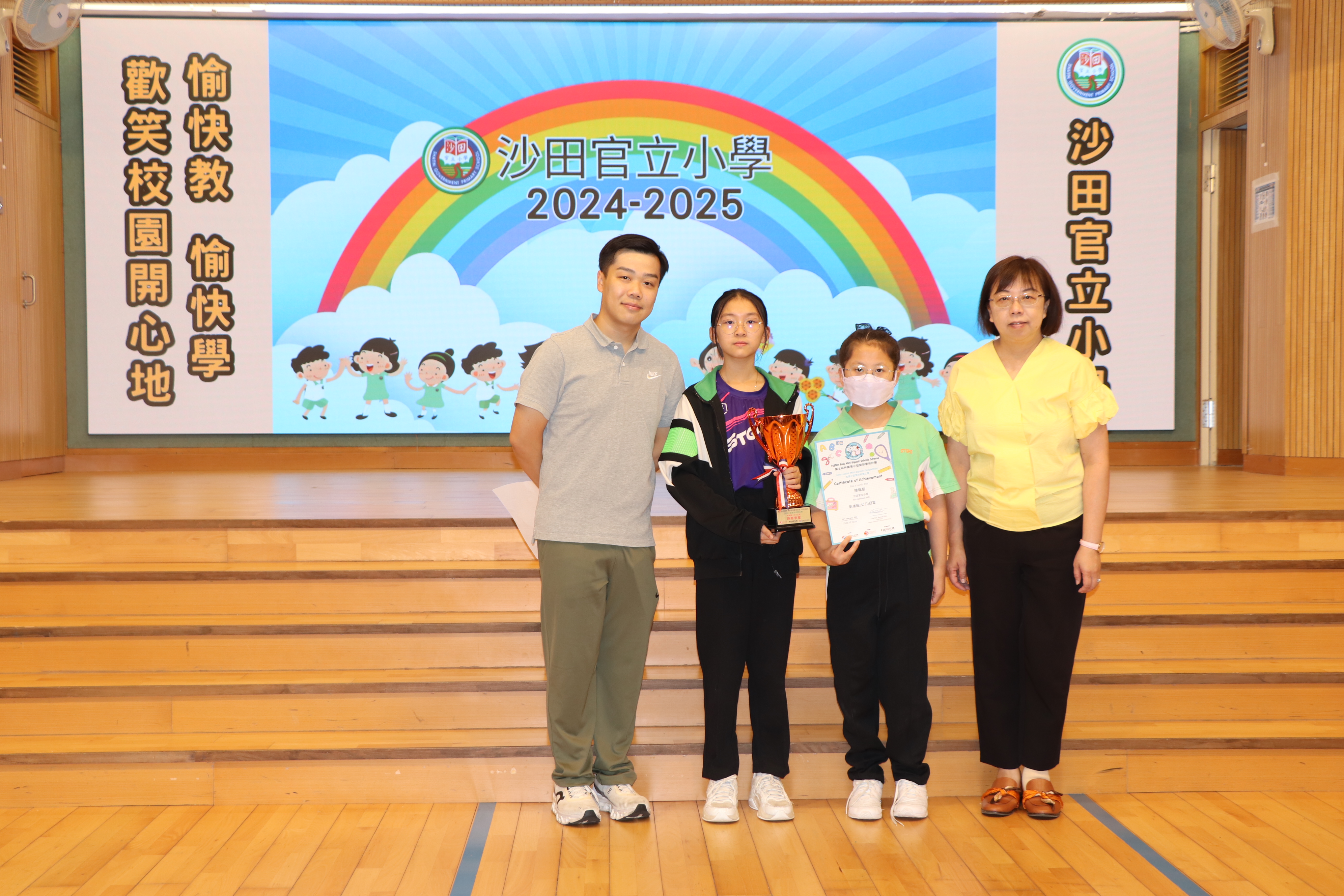 同學從李校長手中接過男子新進組隊際總冠軍的獎盃。
