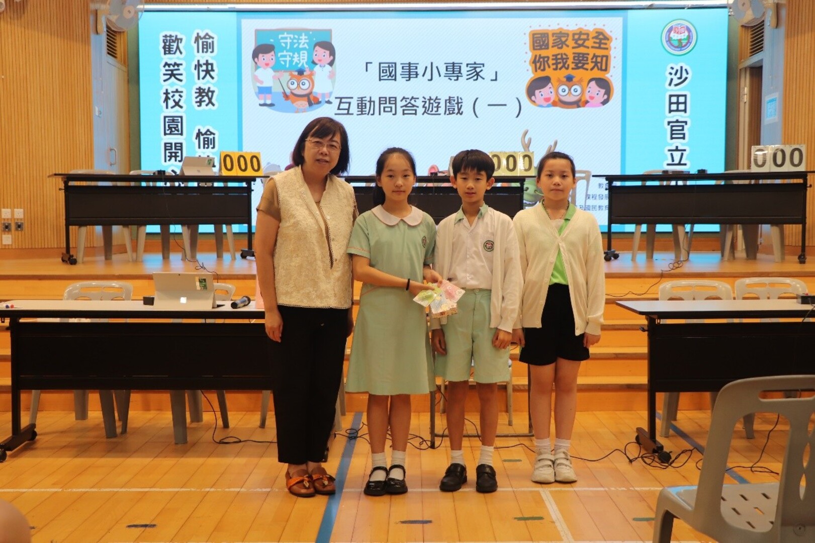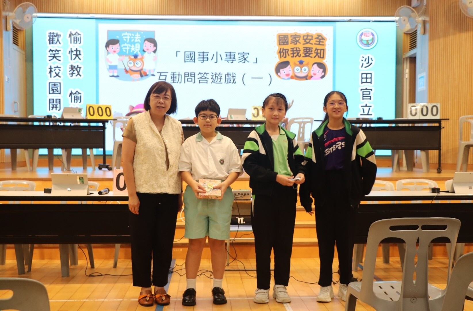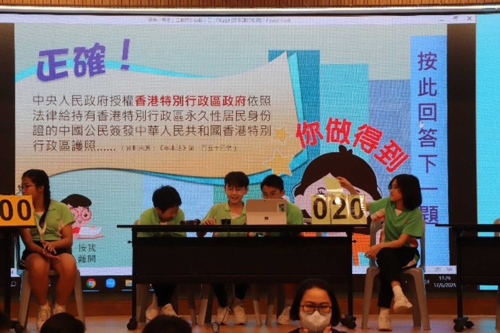 本校四至六年級學生在禮堂進行常識基本法及國情問答比賽,比賽分兩個回合,第一回合賽事由全班同學於網上作答,第二回合賽事由各班代表參與現場搶答環節,各班分數爭持激烈,比賽結果如下: