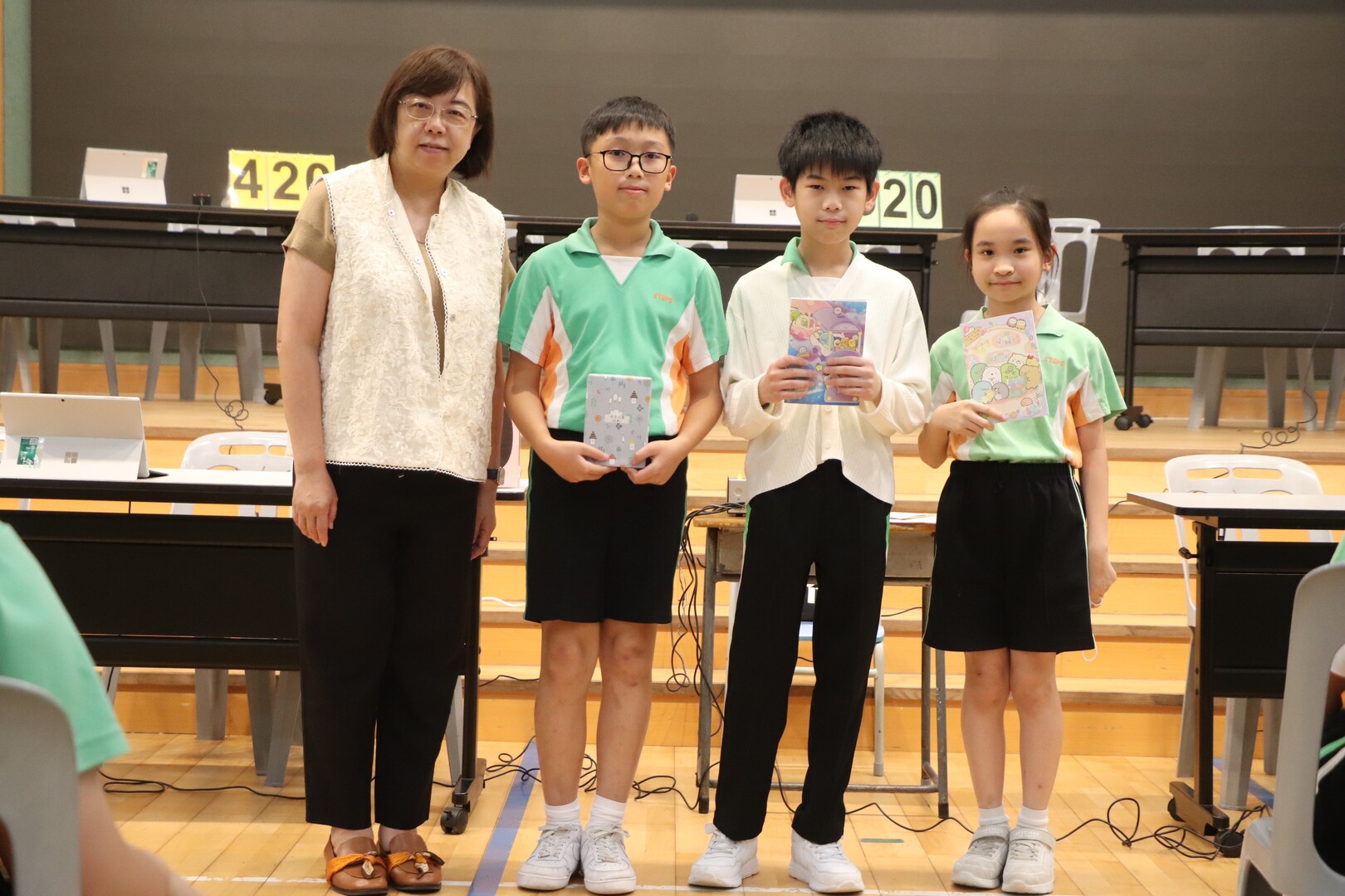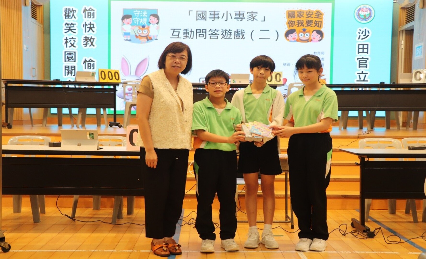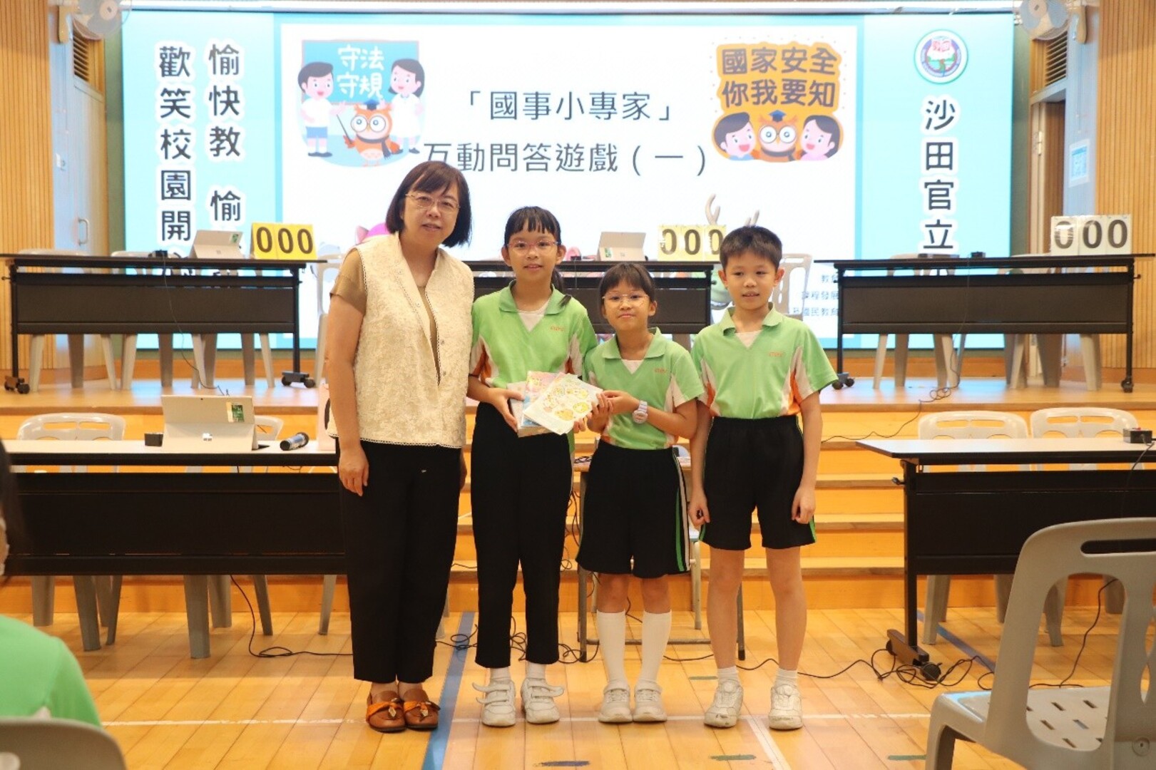 本校四至六年級學生在禮堂進行常識基本法及國情問答比賽,比賽分兩個回合,第一回合賽事由全班同學於網上作答,第二回合賽事由各班代表參與現場搶答環節,各班分數爭持激烈,比賽結果如下: