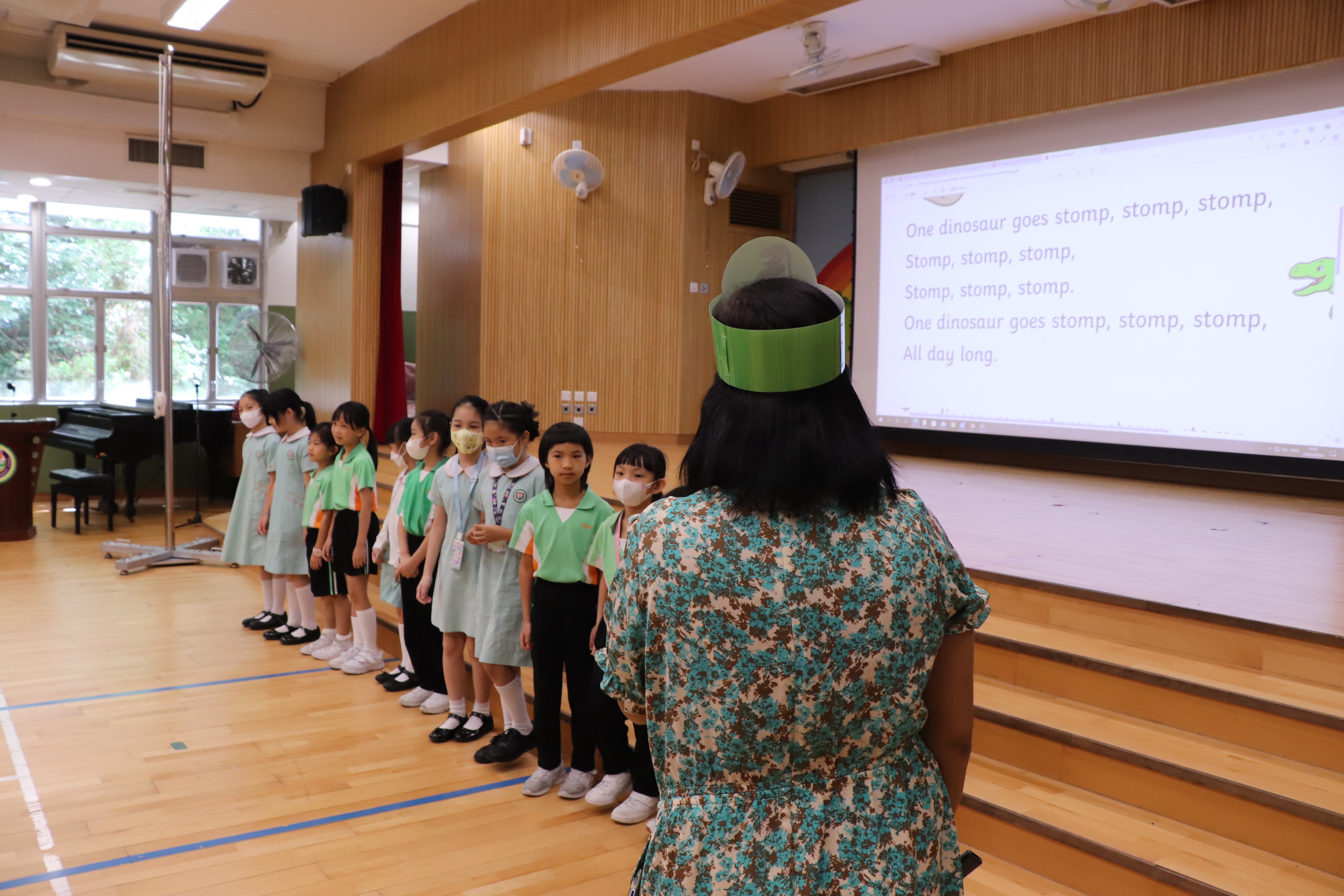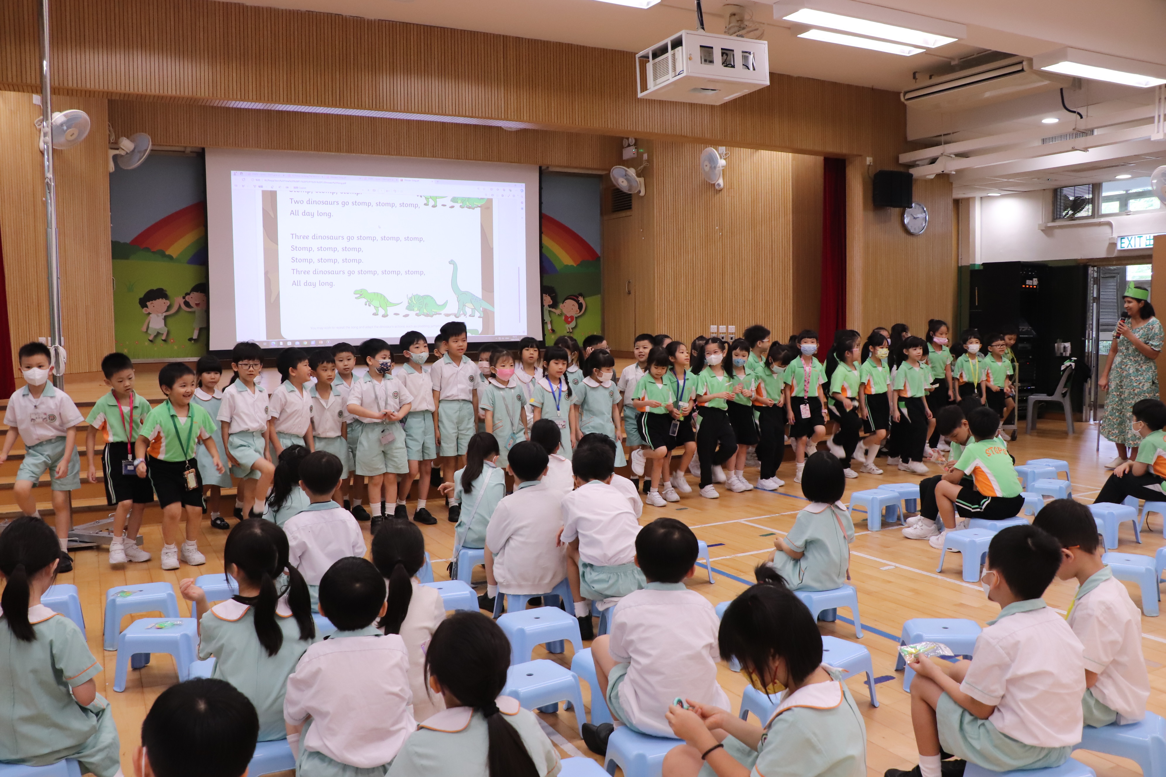 P1 students are enthusiastically singing and stomping along to the "Three Dinosaurs Go Stomp, Stomp, Stomp" song. |