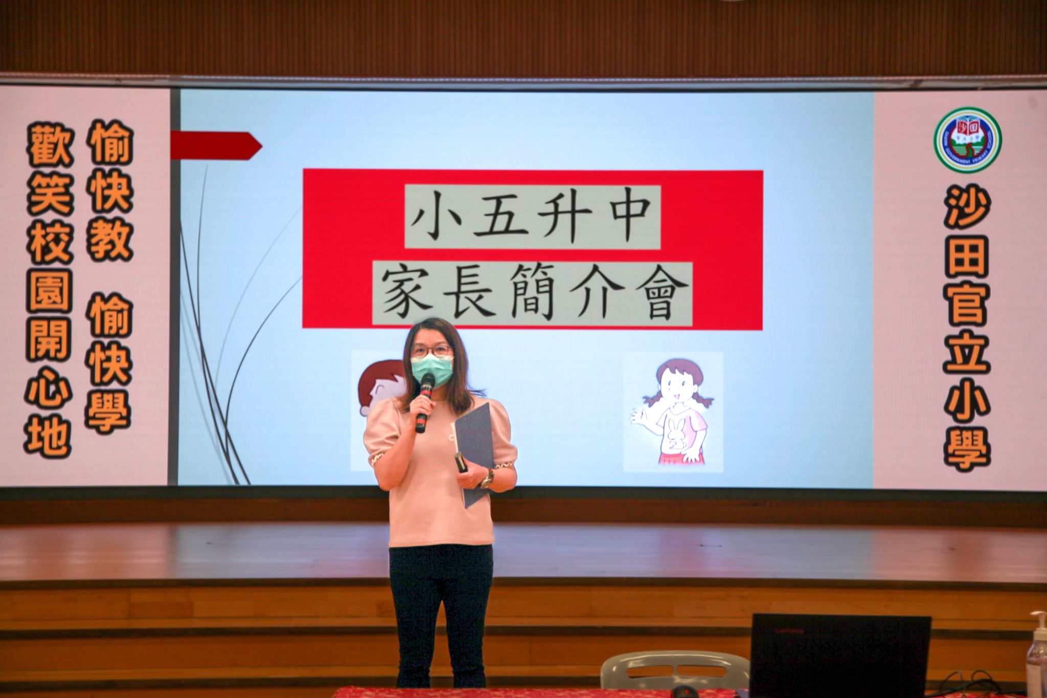 李校長致歡迎詞,歡迎家長蒞臨小五升中家長簡介會。