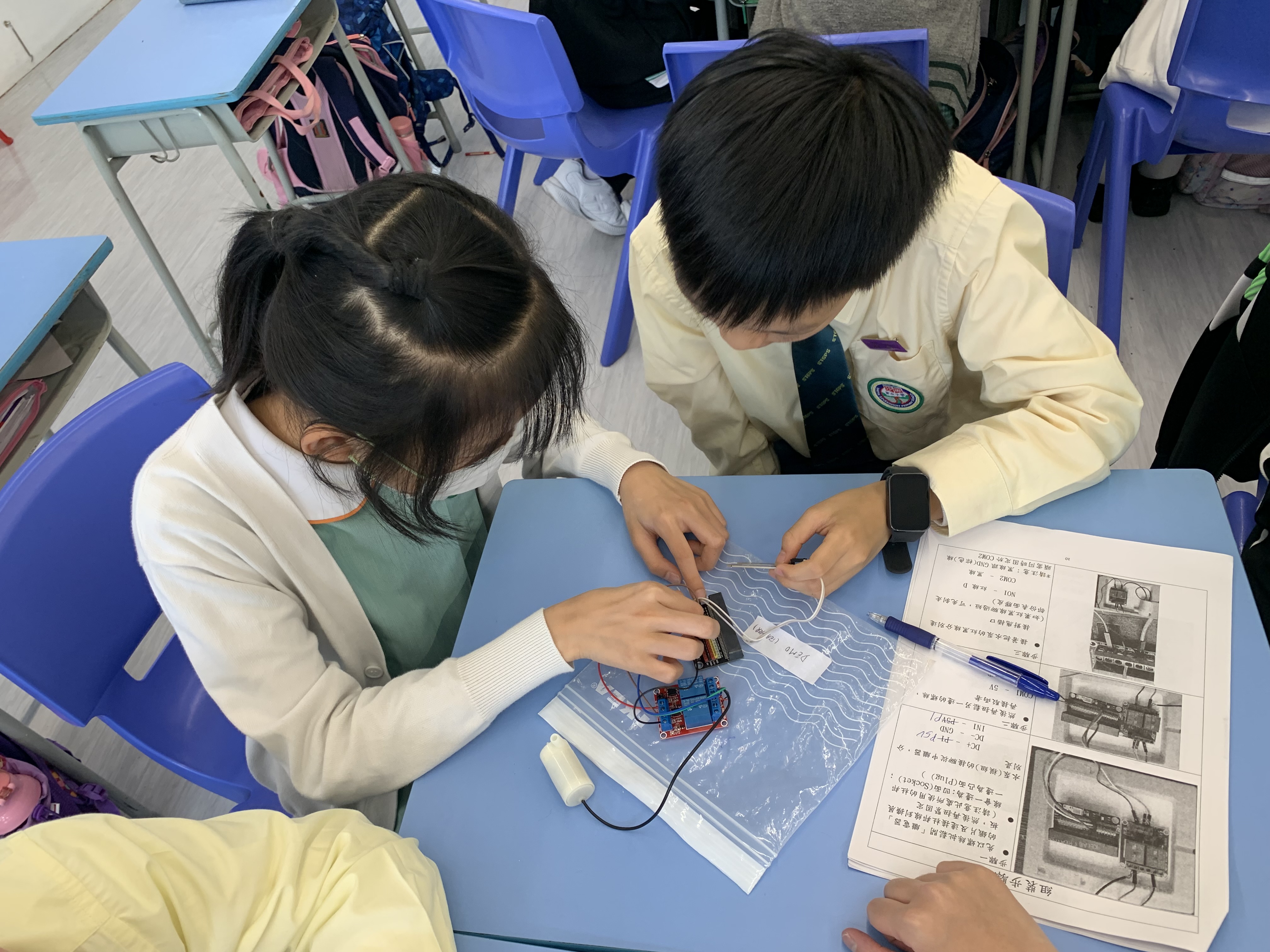 同學們小心翼翼地利用電線接駁感應器、處理器及繼電器。