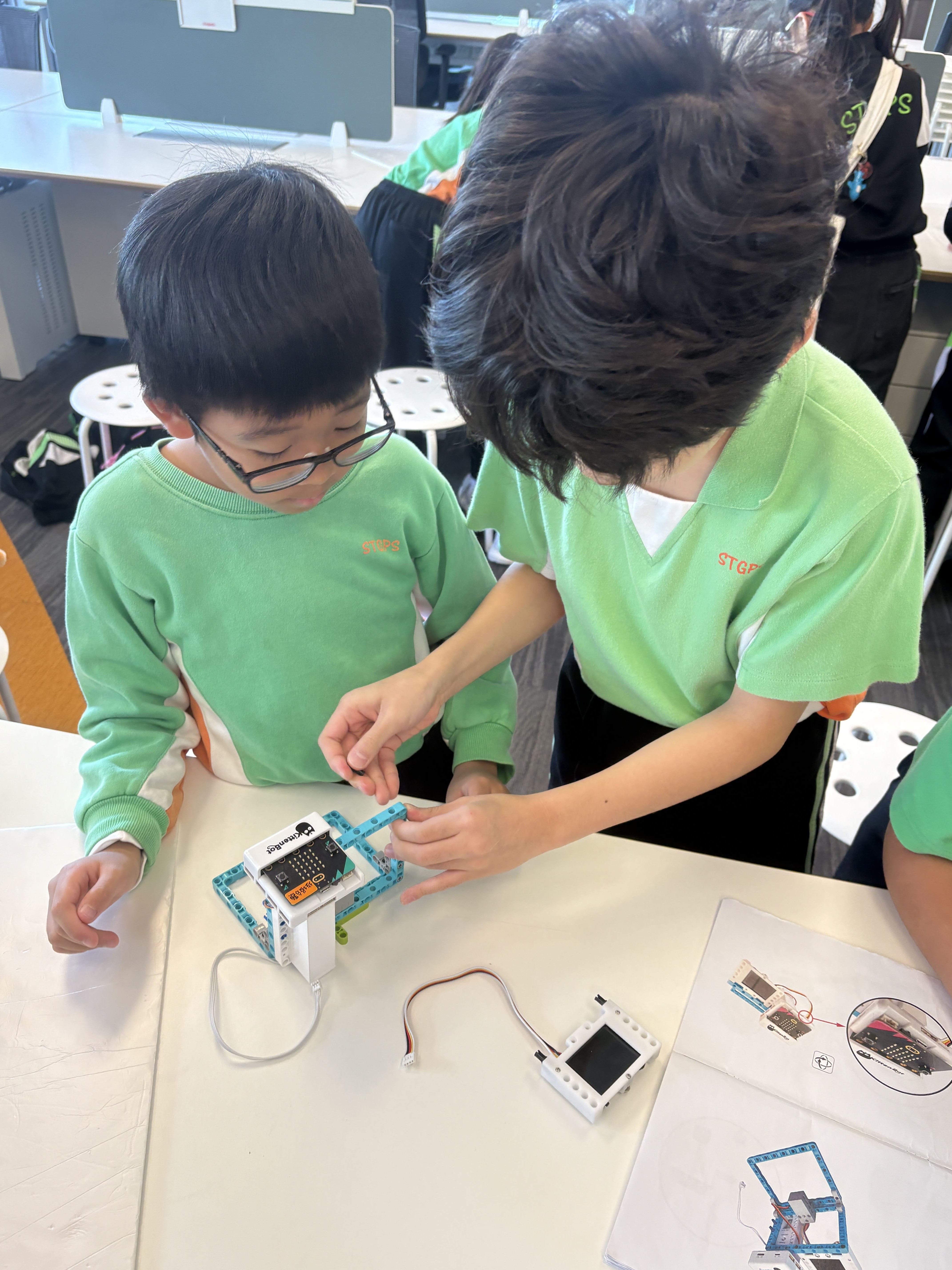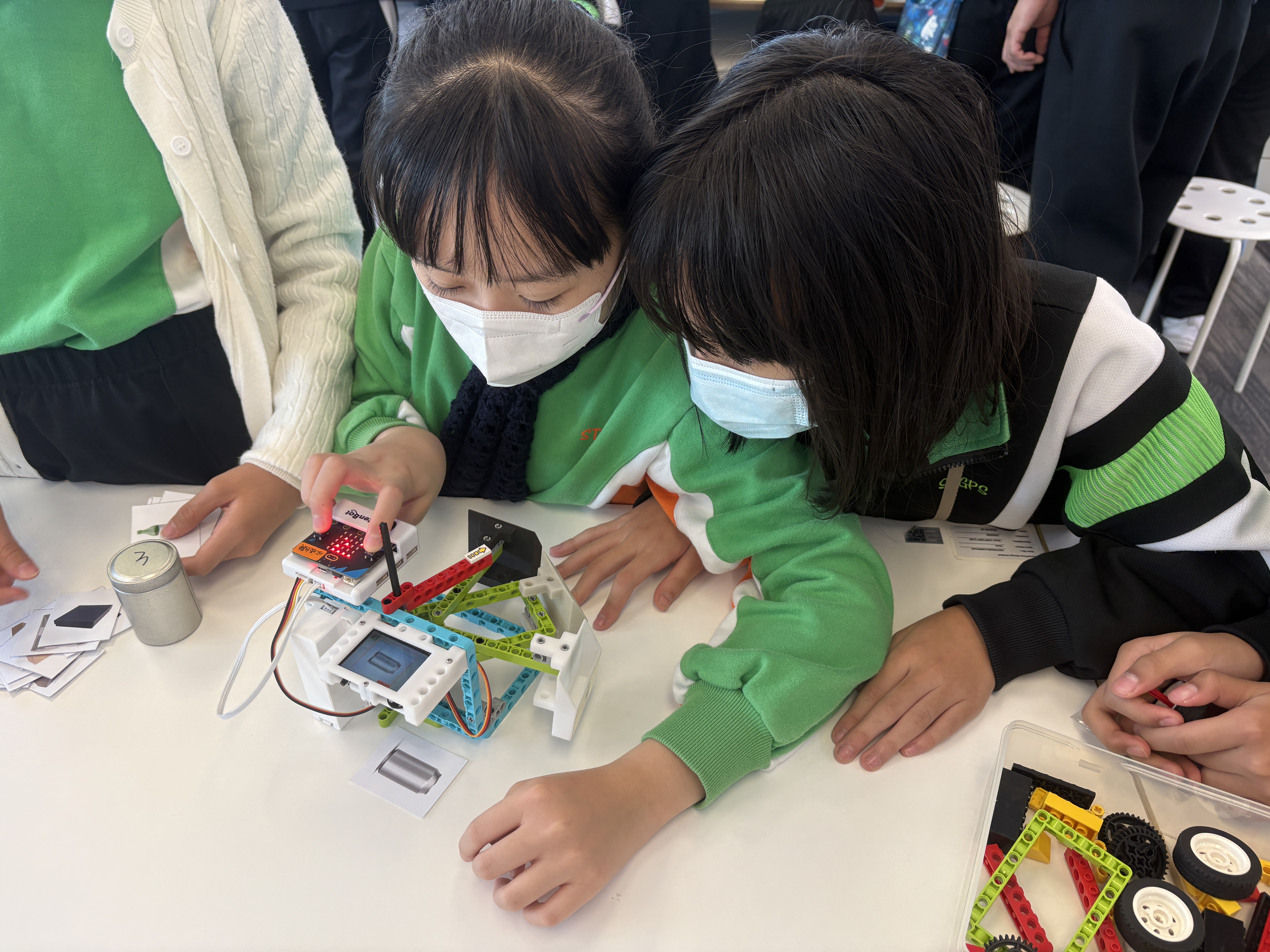 同學們小心翼翼地拼砌部件,並運用程式來培訓機器人進行物件分類辨識。