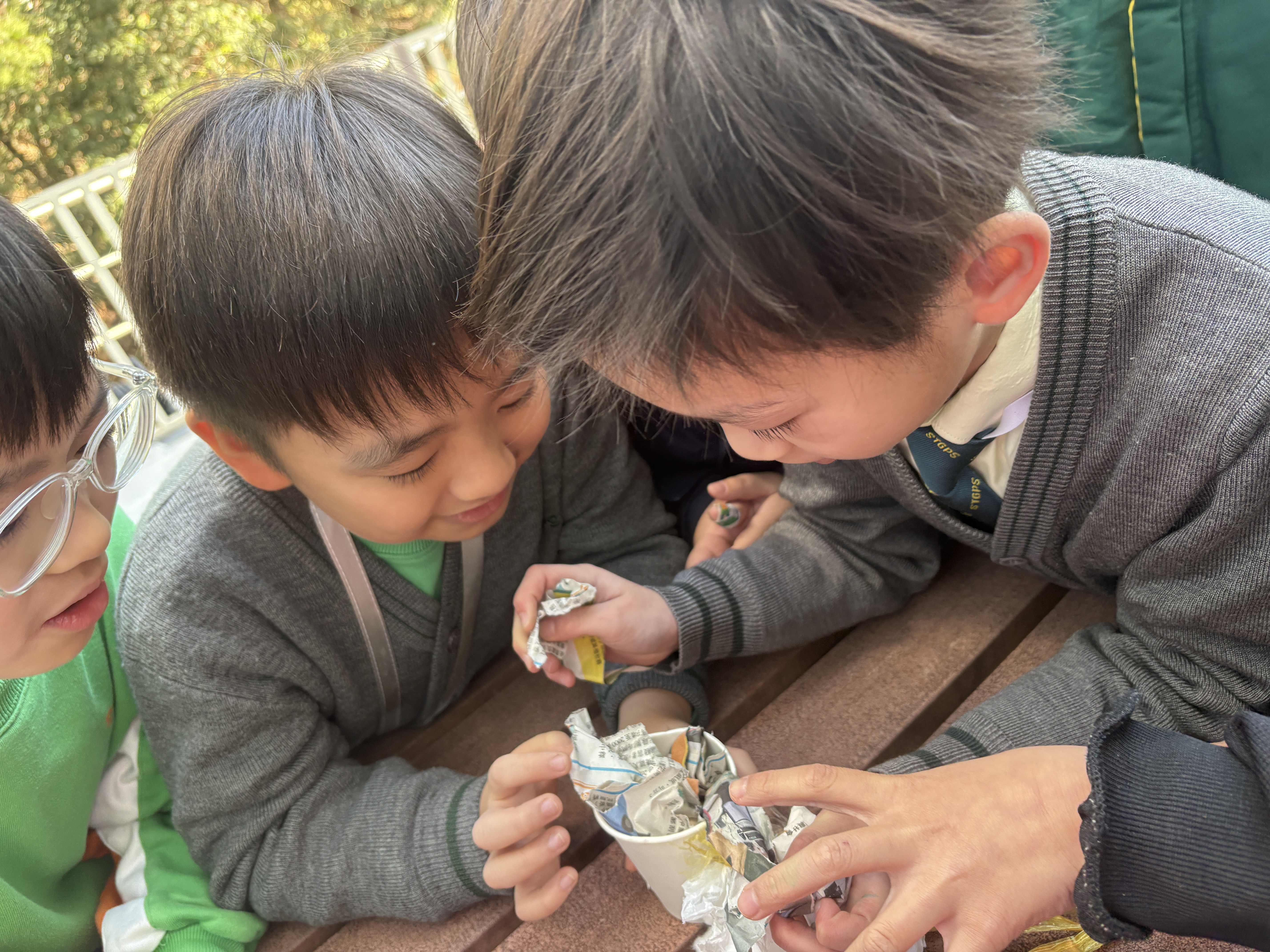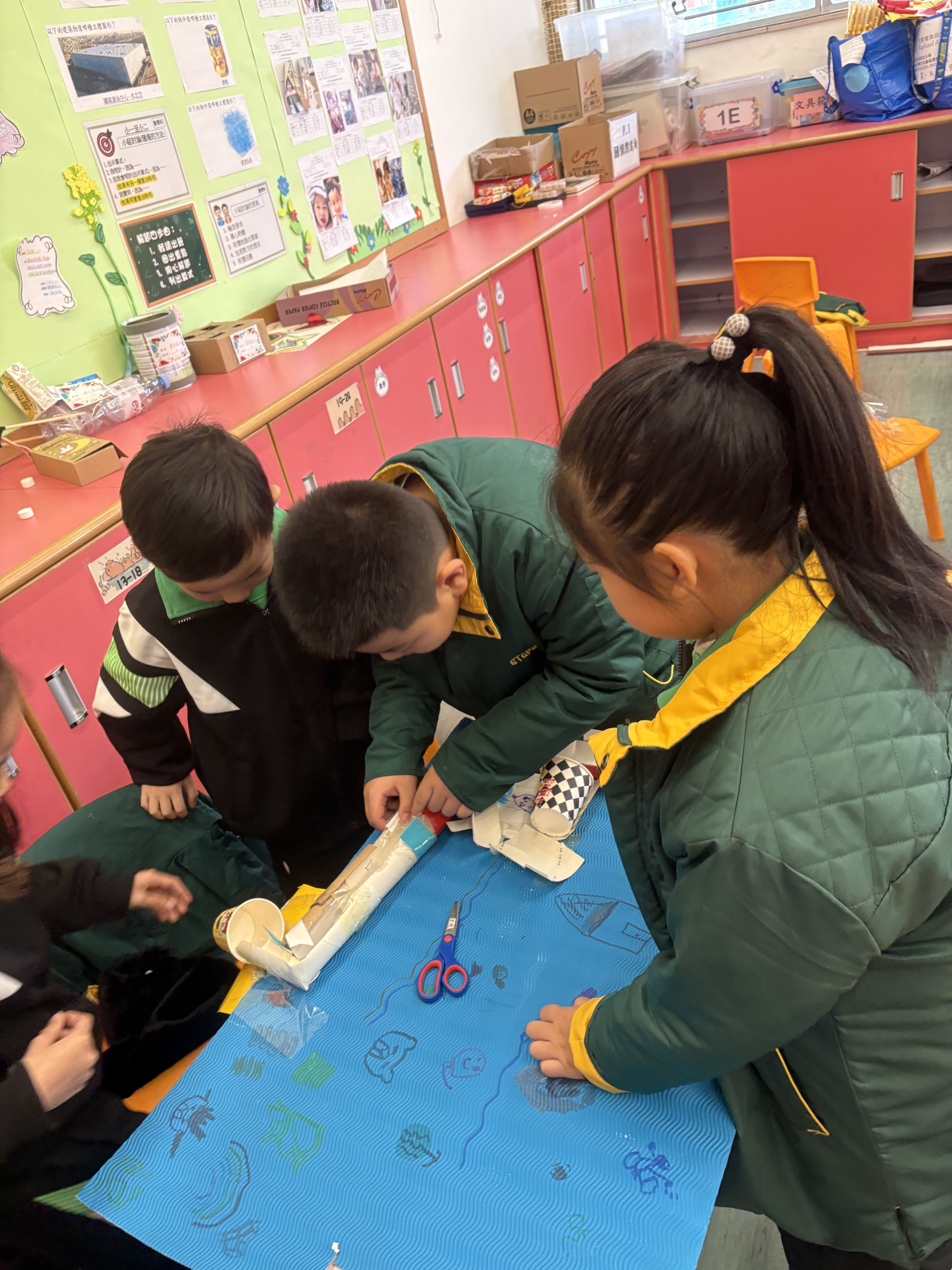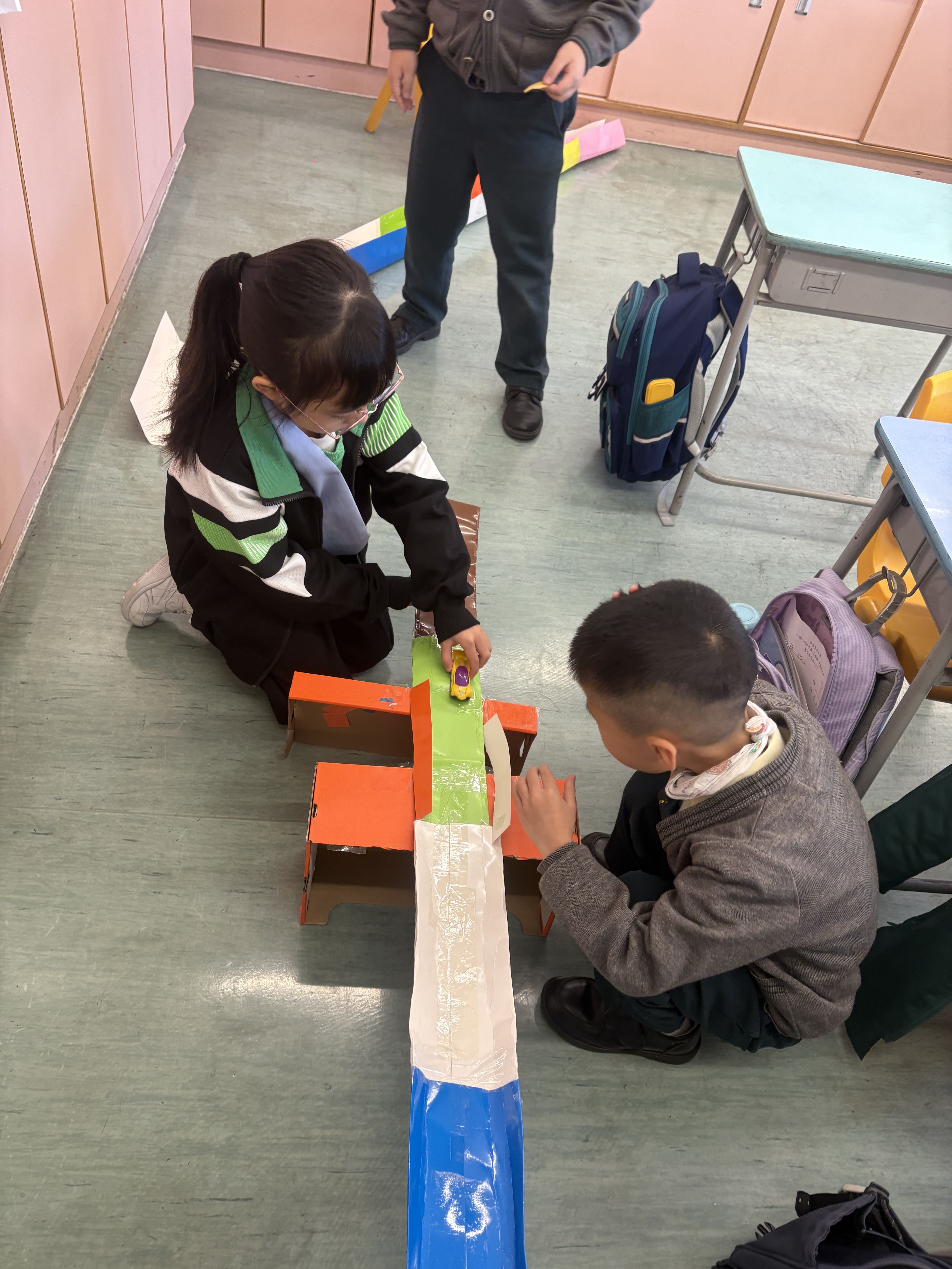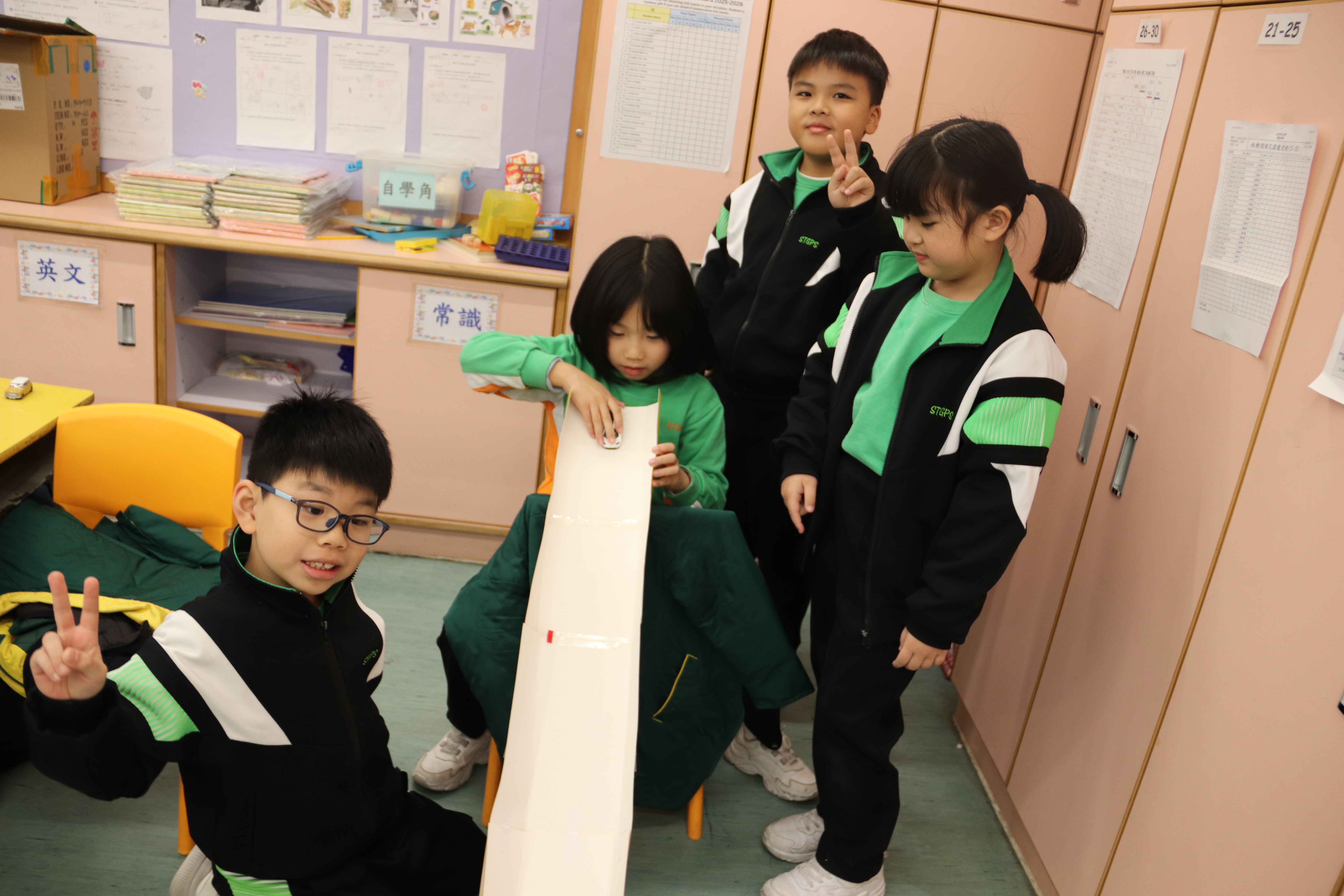 一年級同學發揮合作精神,一起設計讓小球通過的路軌。 |
