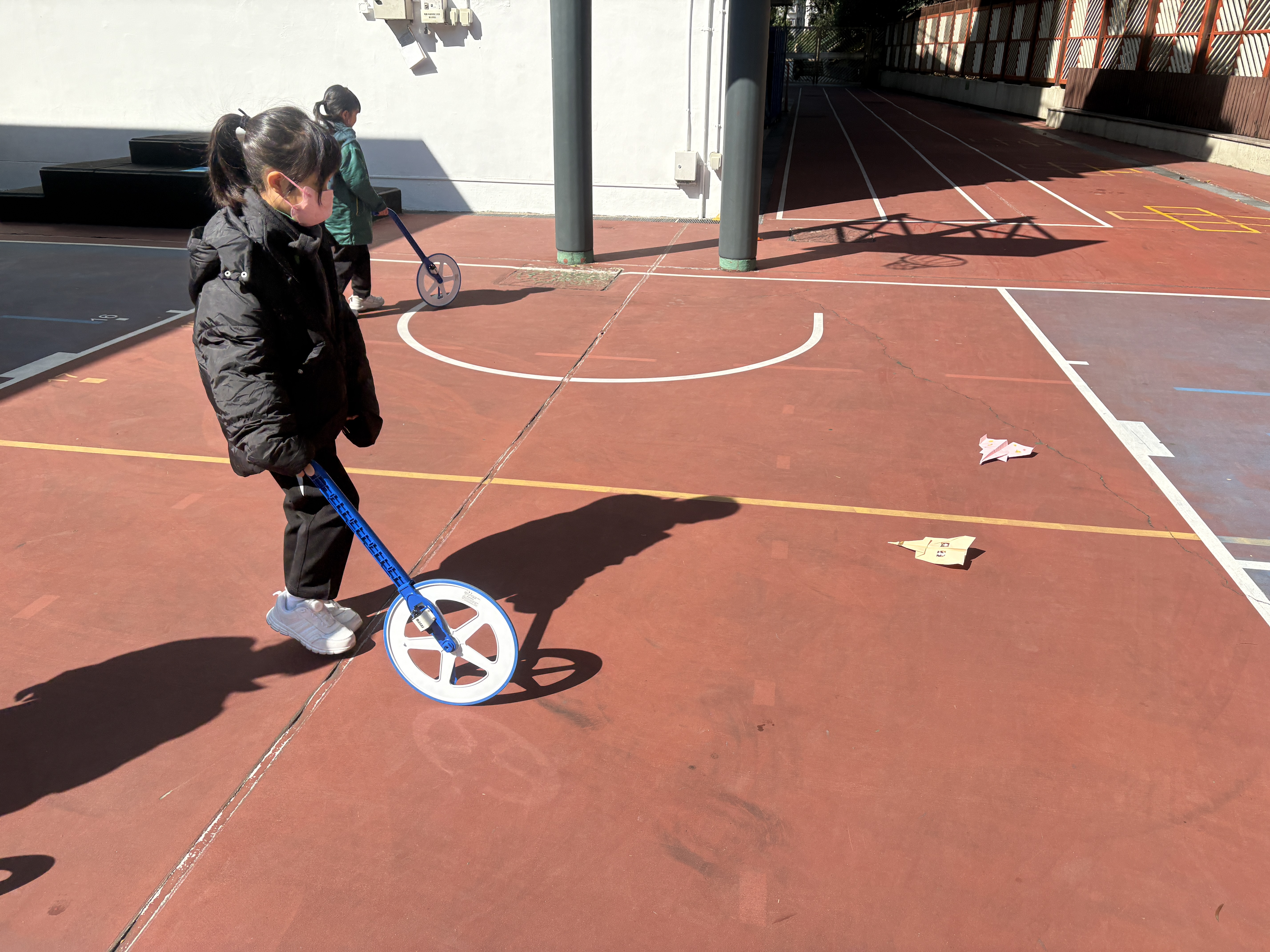 | 同學利用滾輪量度紙飛機的飛行距離,是活學活用的數學知識啊! | ||