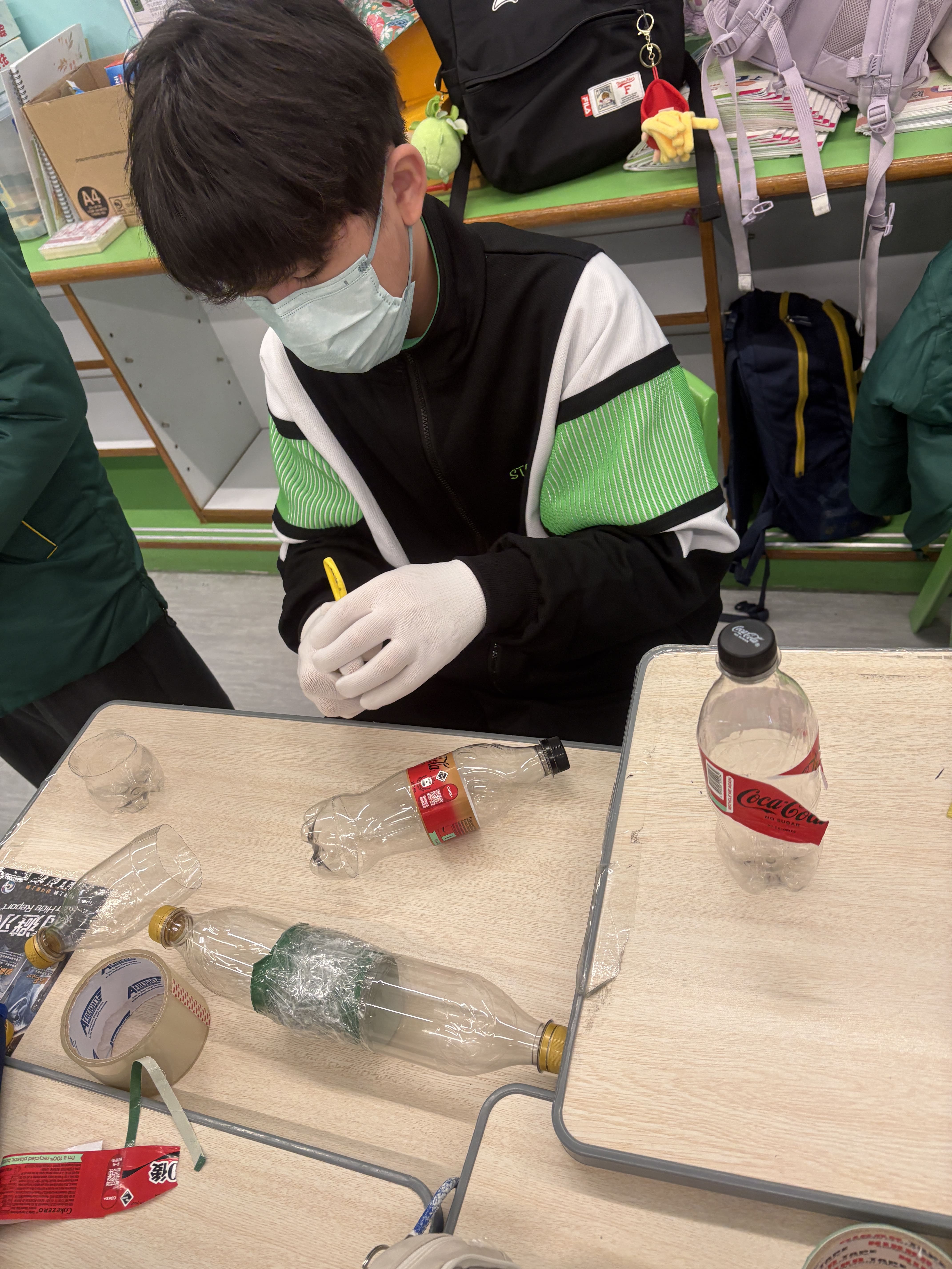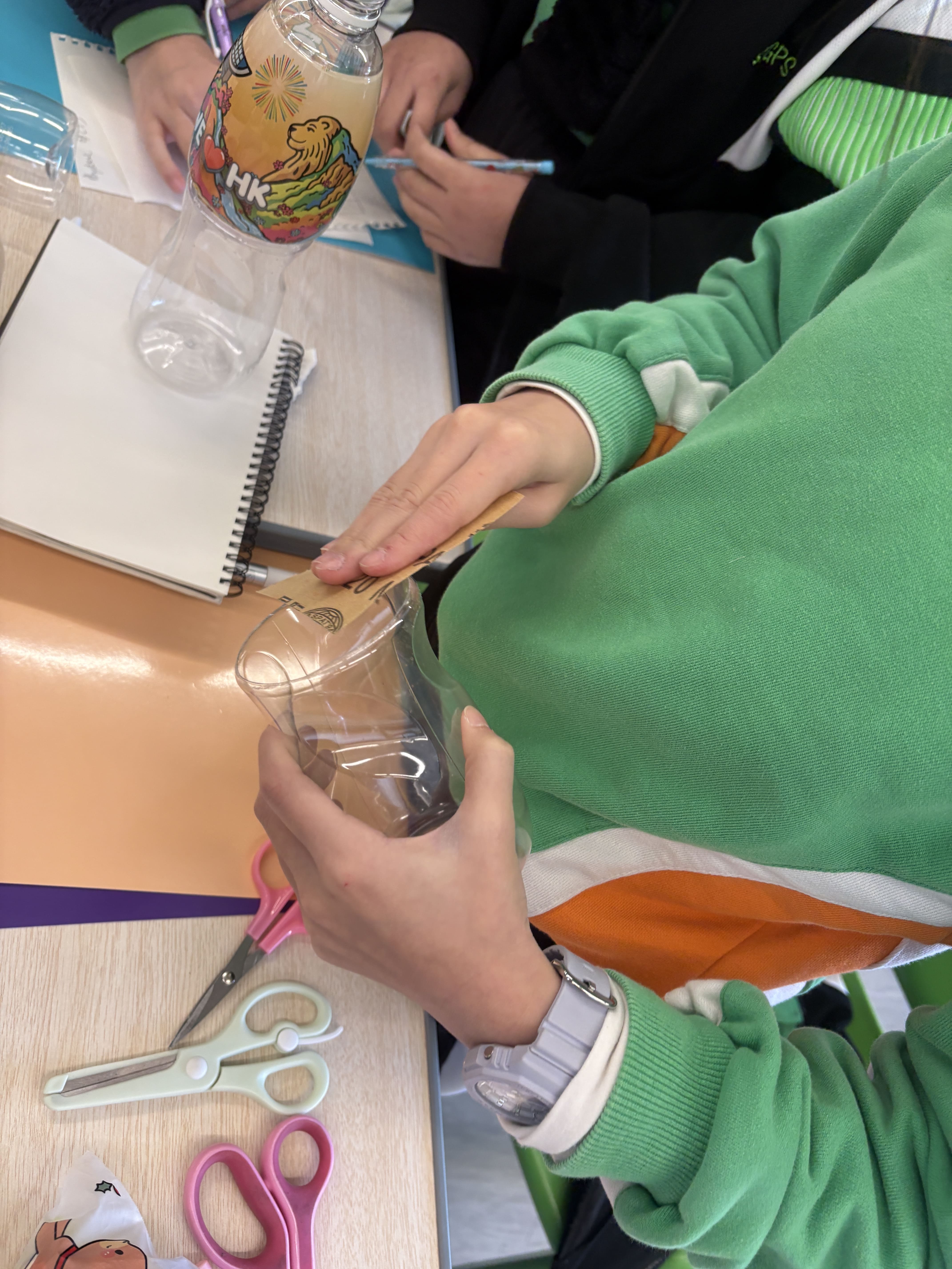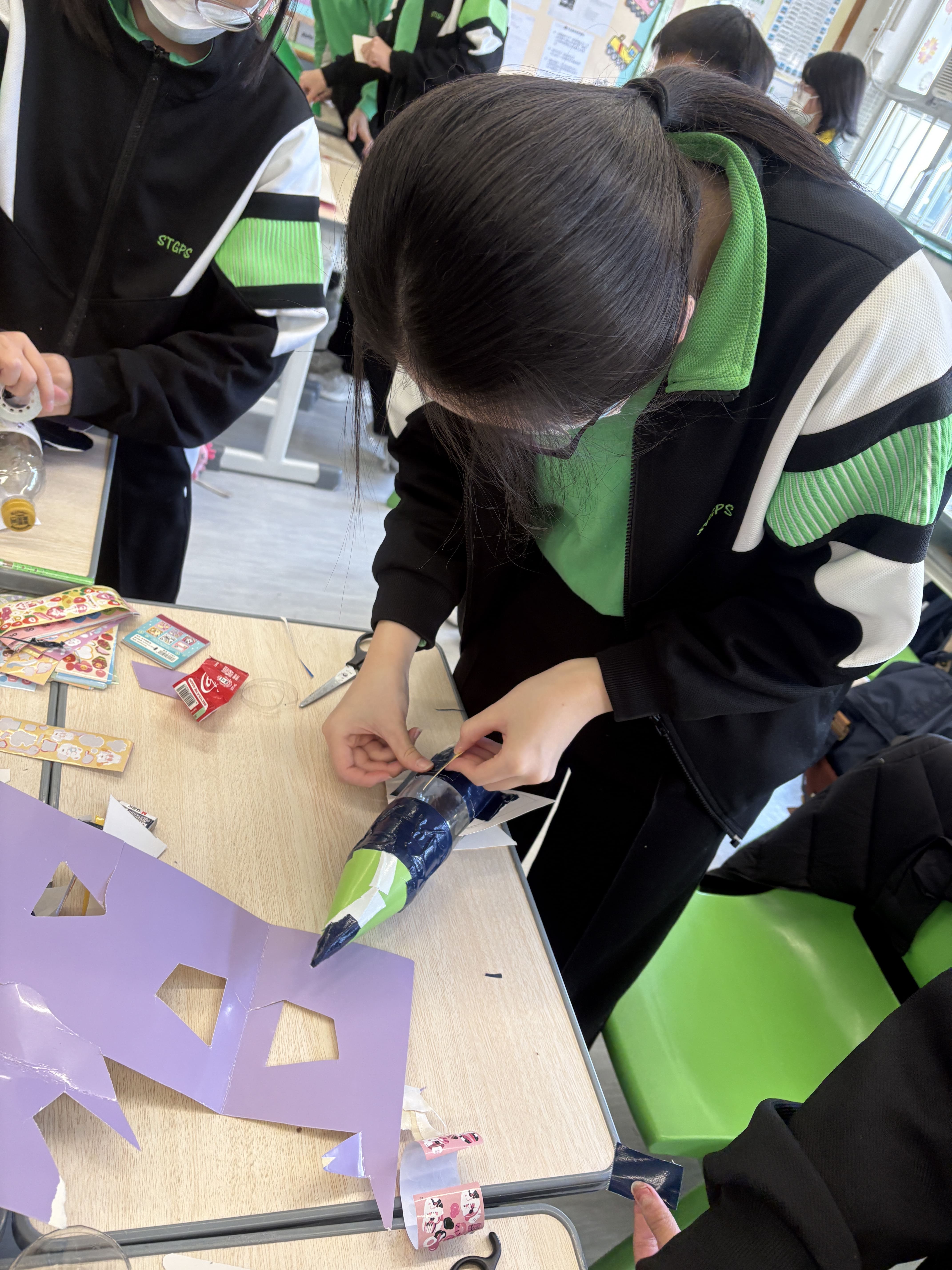 | 同學們充分理解水火箭的鼻錐及尾翼的作用後,認真地根據設計圖製作水火箭。 | |||