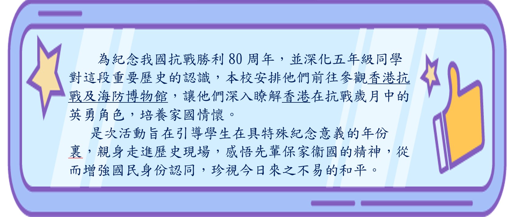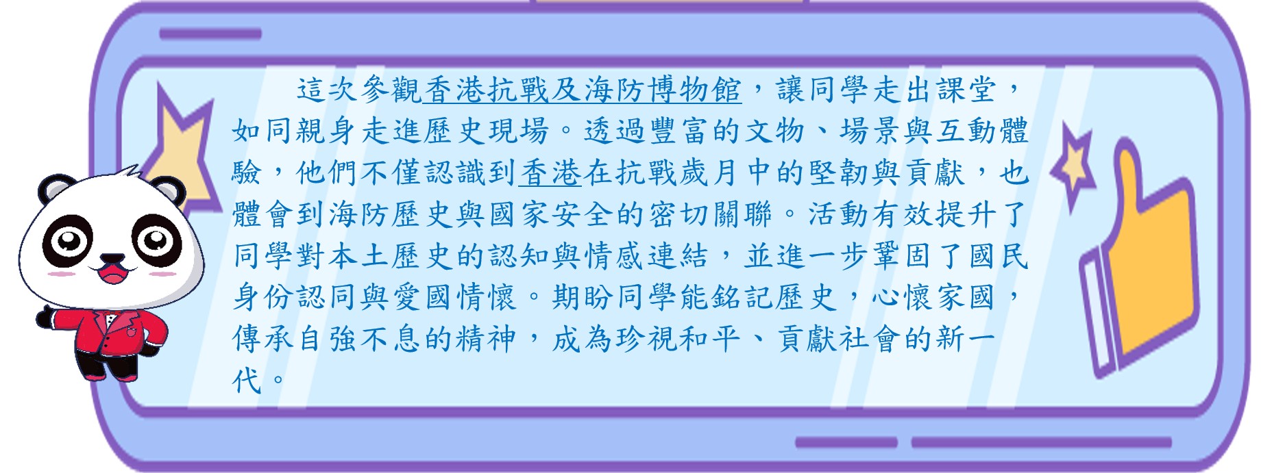 同學們透過參觀抗戰主題展覽及遊覽史蹟徑,透過實物與圖文,生動學習抗戰歷史,激發對民族精神的認同與傳承。