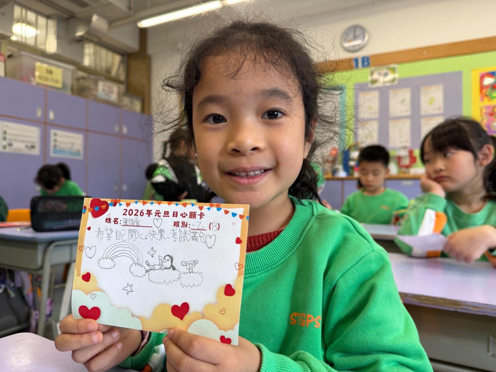 為迎接2026年新一年的開始,本校於1月6日早上舉行元旦日慶祝活動。活動開始,全校師生齊聚參與莊嚴的升旗儀式,隨後由6A班彭子柔和李凱欣帶來了精彩的旗下講話,他們不僅分享了迎接元旦的喜悅之情,還說出對未來生活的憧憬。升旗儀式結束後,學校還安排了全校每一位同學獲發一張心願卡,主題是「新年新氣象,逐夢2026」。每位同學在心願卡上寫上今年的學習目標、追求健康生活的理想,還有自己的未來夢想。國民教育組集齊同學的心願卡後,選取最有代表性的心願卡掛上剪板上,讓全校老師和同學一齊立下新年的目標,以更積極的態度投入學習與生活,為實現中華民族偉大復興貢獻力量。