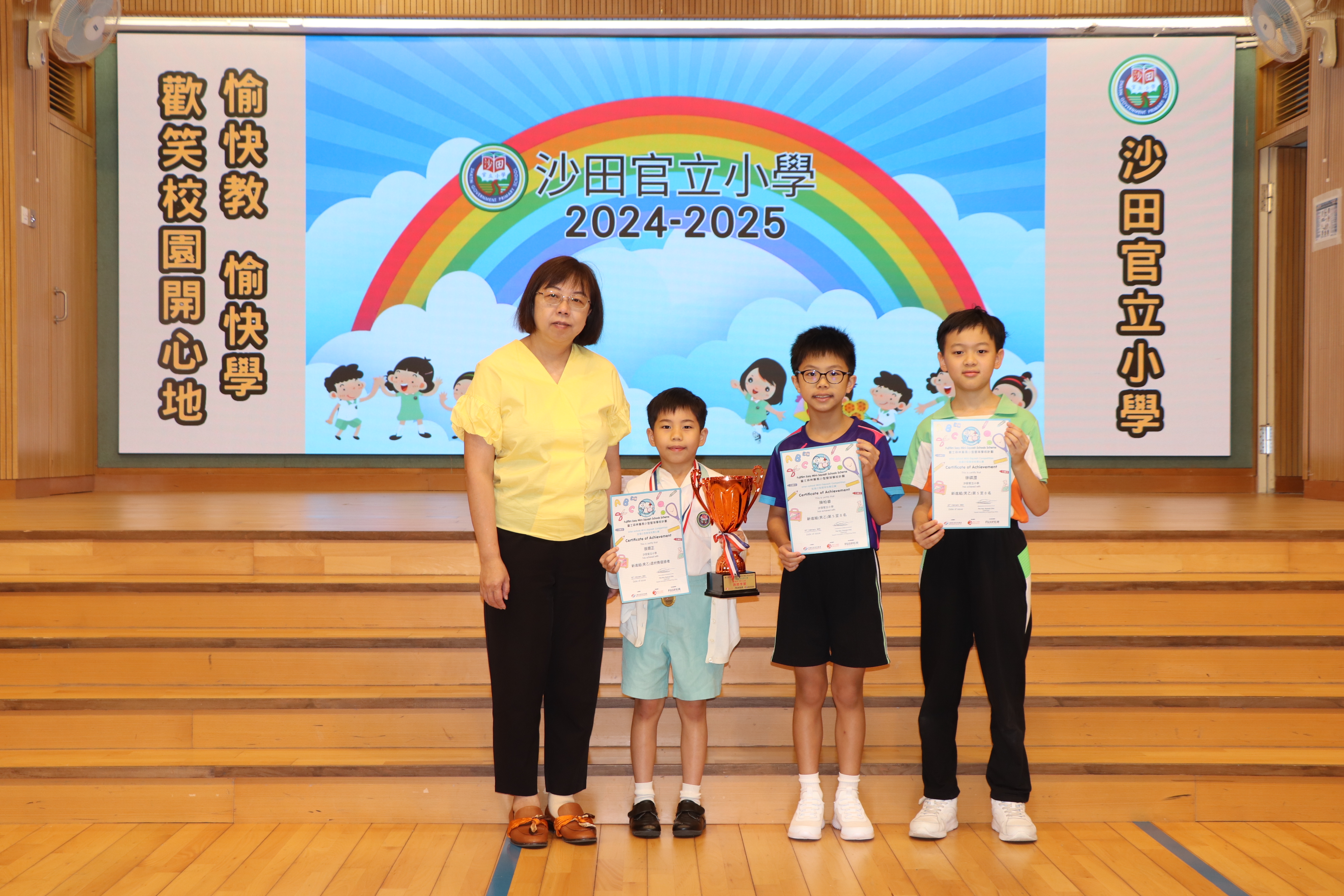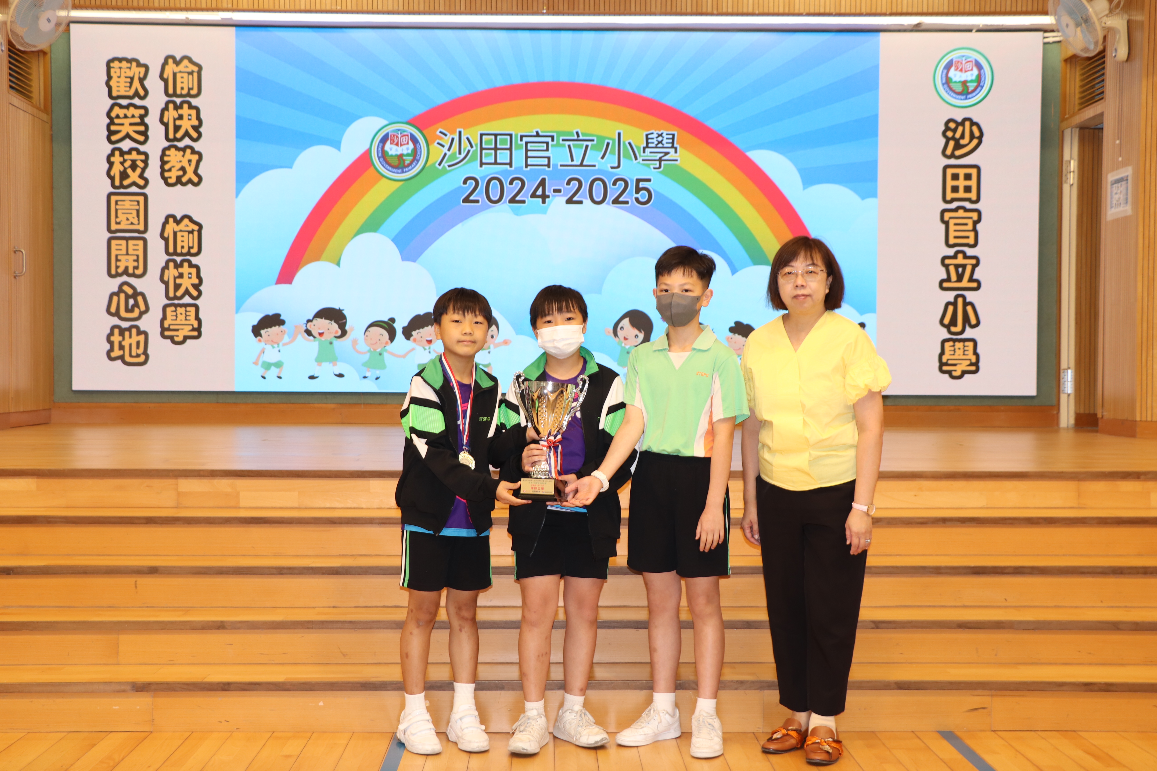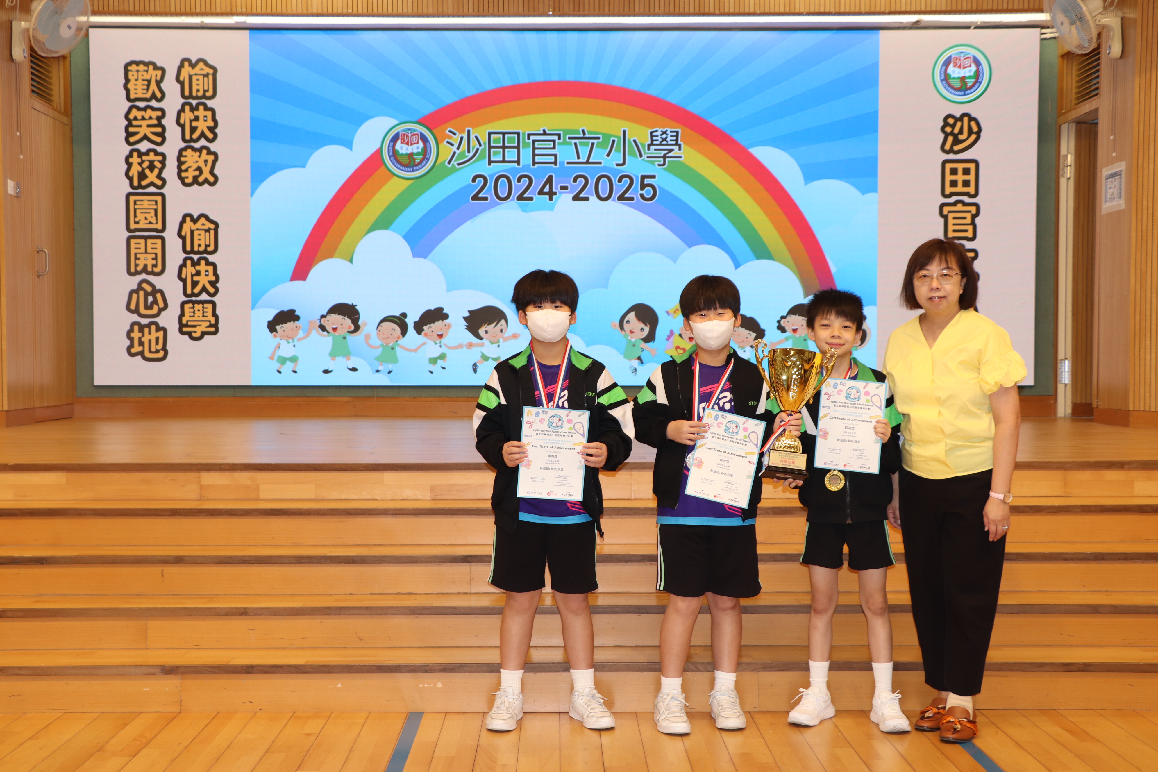 同學從李校長手中接過男子新進組隊際總冠軍的獎盃。