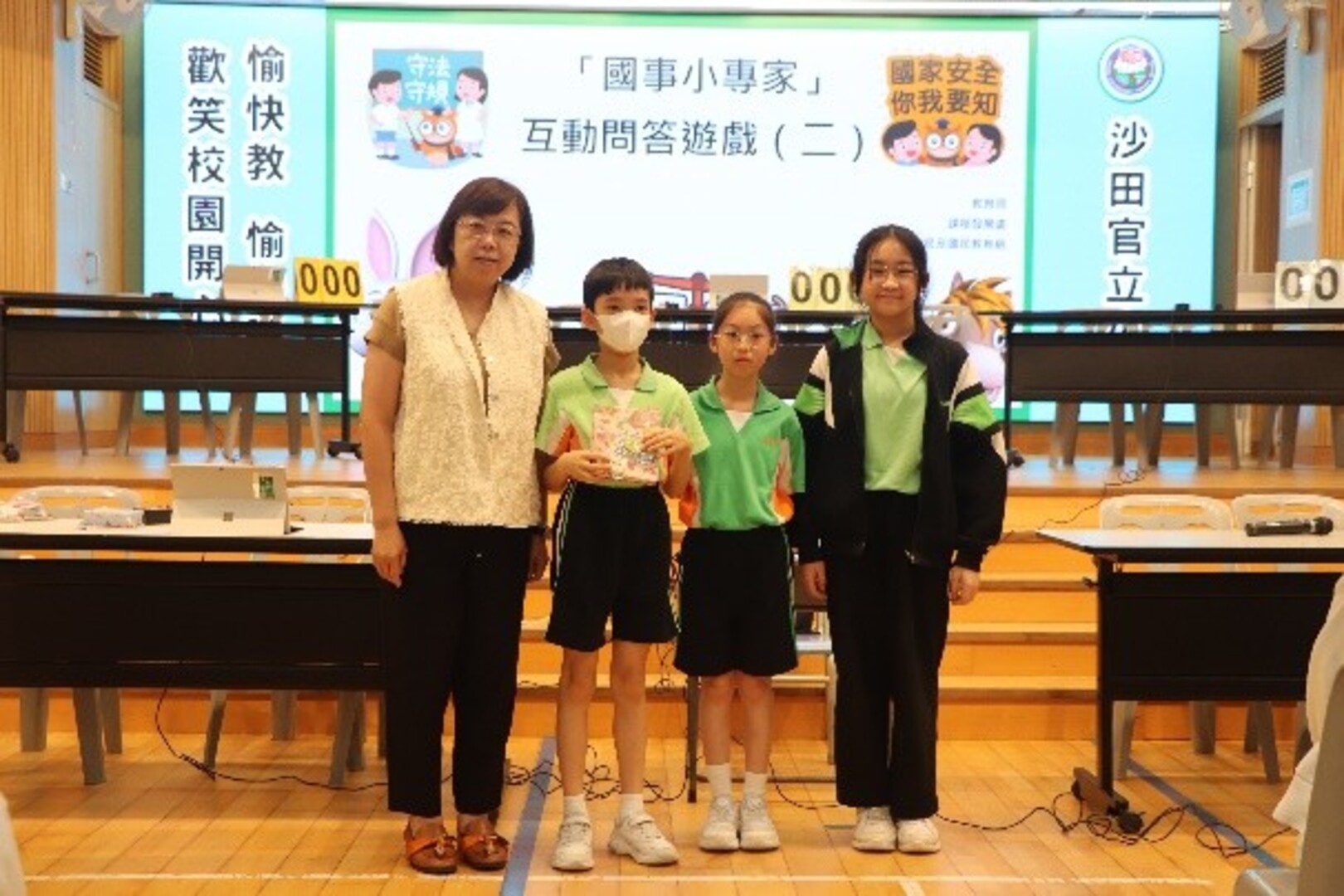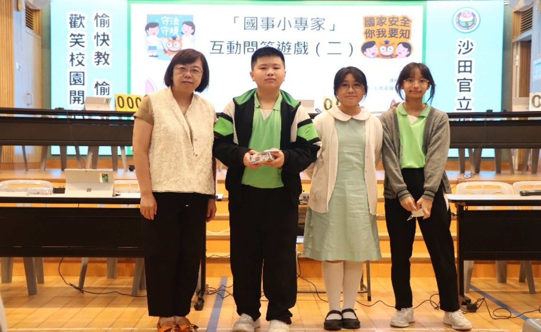 本校四至六年級學生在禮堂進行常識基本法及國情問答比賽,比賽分兩個回合,第一回合賽事由全班同學於網上作答,第二回合賽事由各班代表參與現場搶答環節,各班分數爭持激烈,比賽結果如下: