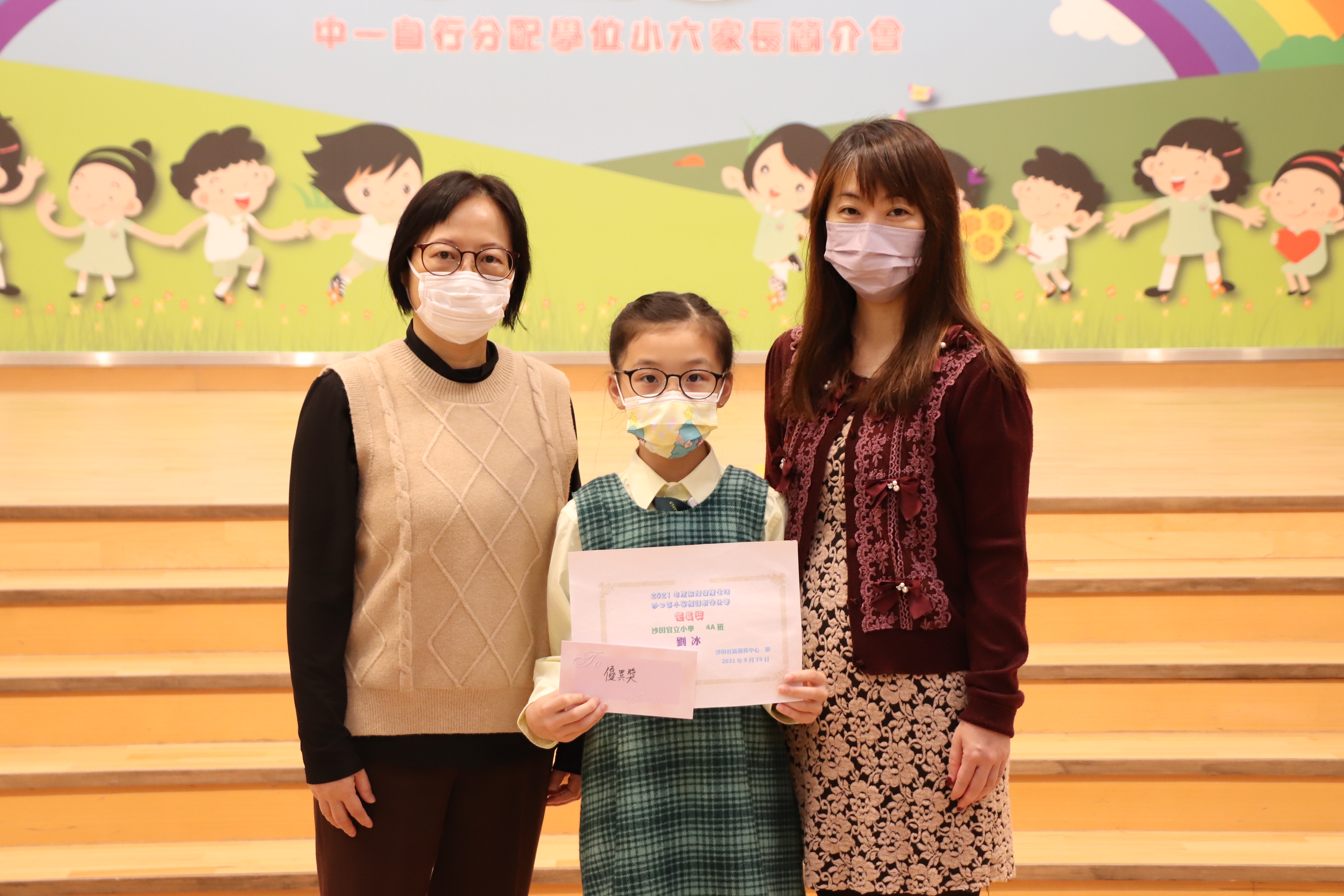 5B劉冰於「2021年度無煙健康生活沙田區小學標語創作比賽」中獲得優異獎,她獲頒發獎狀及書劵。
