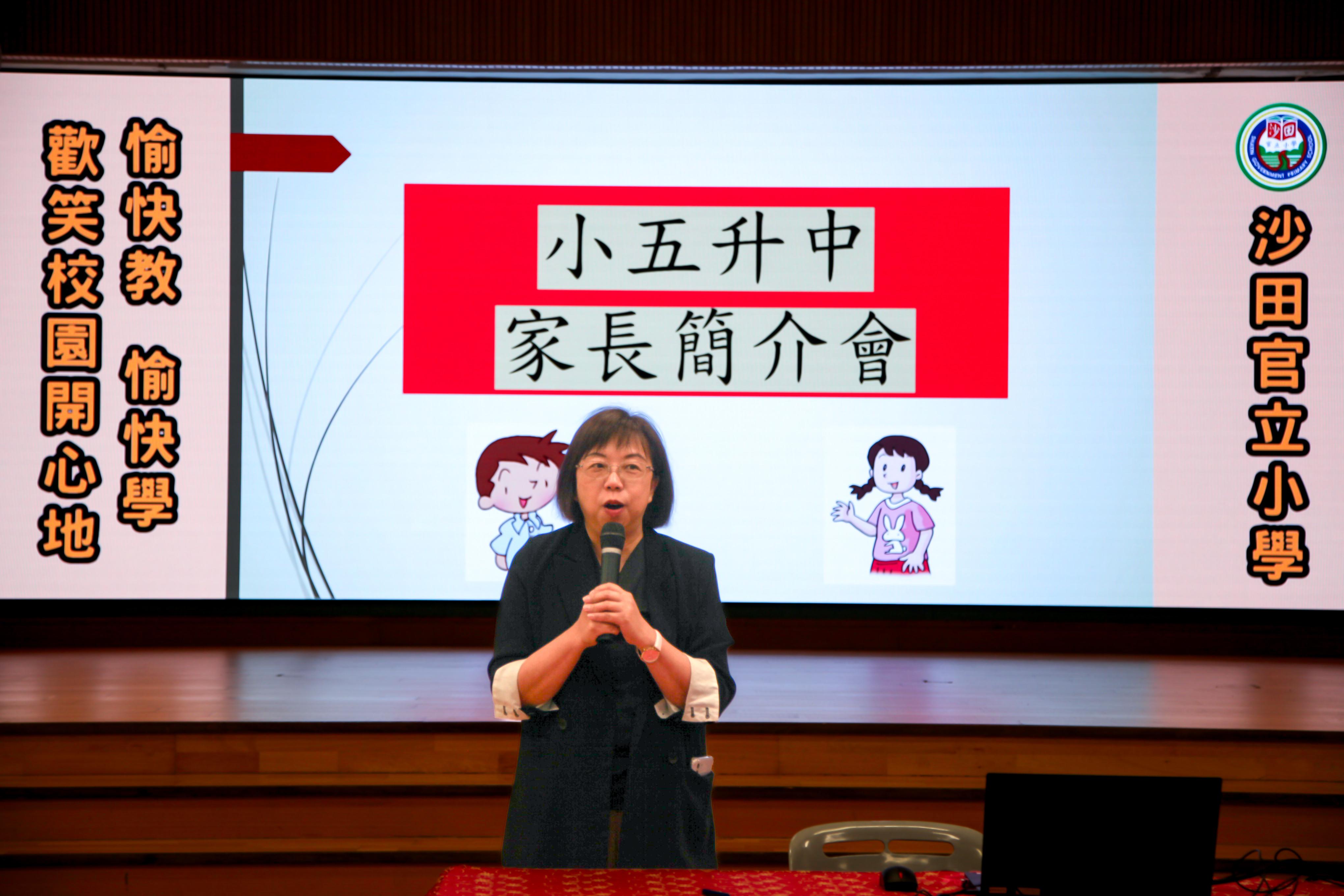 李校長致歡迎詞,歡迎家長蒞臨小五升中家長簡介會。